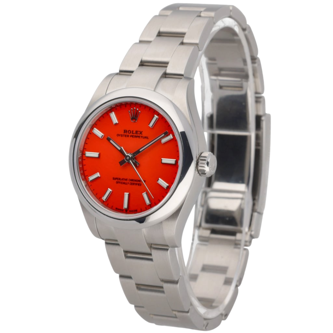 This Rolex Oyster Perpetual reference 277200 is presented in stainless steel and paired with the striking red dial that defines the modern Oyster Perpetual range. Measuring 31mm, the Oyster case offers balanced proportions with a refined wrist presence, while the smooth bezel and clean dial layout underscore the model’s timeless, everyday appeal. The vivid red finish adds a contemporary edge to one of Rolex's most recognisable designs.