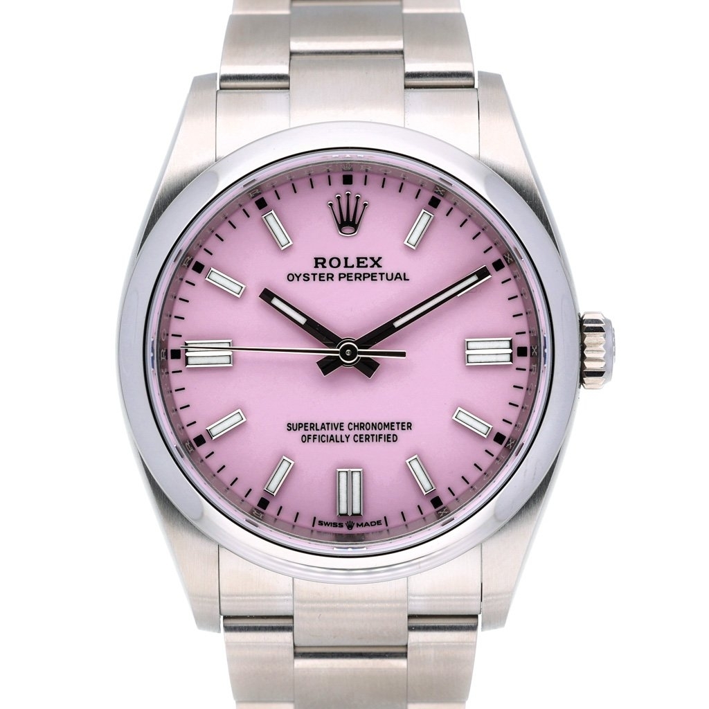 This 2025 Rolex Oyster Perpetual reference 126000 is presented in immaculate condition, featuring the highly sought-after 36mm stainless steel Oyster case paired with a soft pink dial. The balanced 36mm size remains one of the most liquid and versatile formats in the modern Rolex catalogue, appealing to both collectors and investors. The smooth bezel and Oyster bracelet create a clean, understated profile, allowing the dial colour to take centre stage while retaining everyday wearability.