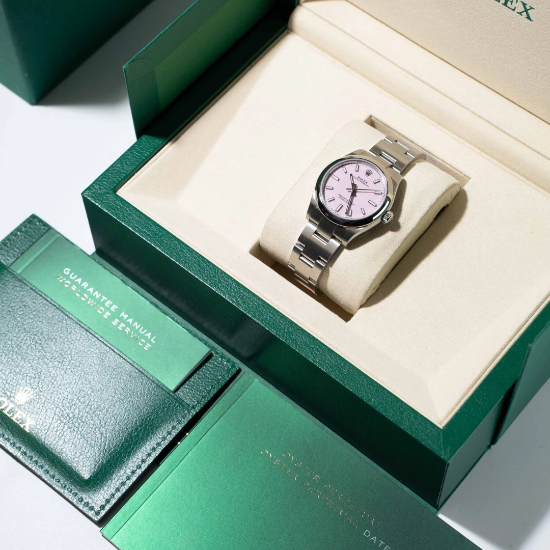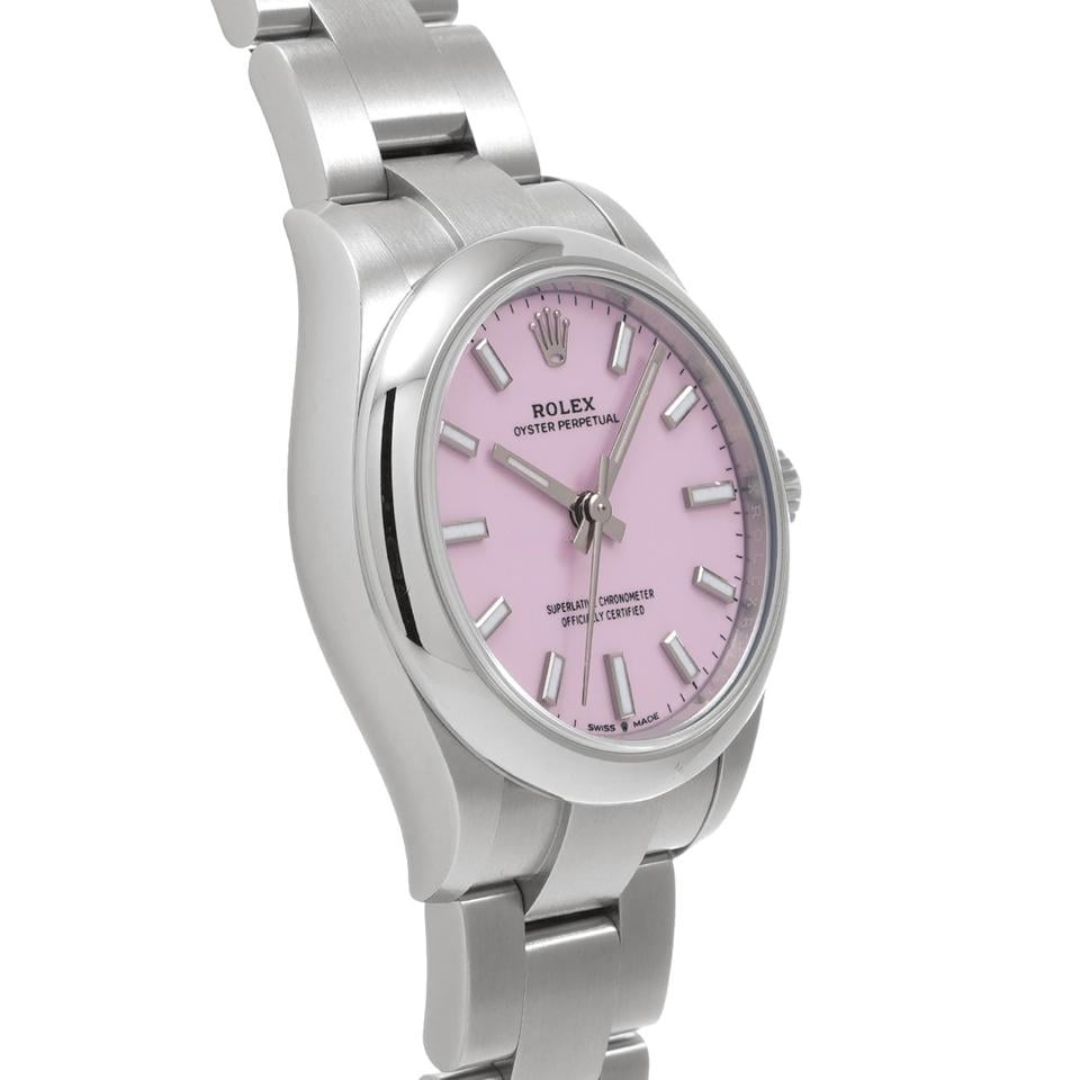 A Rolex Oyster Perpetual 31 reference 277200 in stainless steel, presented with a smooth bezel and Oyster bracelet, offering a refined and contemporary interpretation of this iconic Rolex design. The candy pink dial delivers a bold yet elegant aesthetic, one of the most distinctive and sought-after colour variations in the current Oyster Perpetual range, adding a vibrant edge while maintaining its clean, balanced proportions.