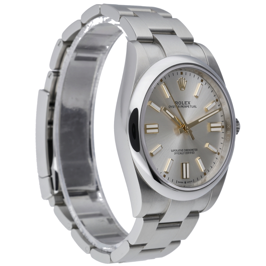 A Rolex Oyster Perpetual 41 reference 124300 in stainless steel, featuring a smooth bezel and an Oyster bracelet, embodies the purest expression of Rolex design. The silver dial delivers a clean, understated aesthetic, enhanced by applied baton hour markers and luminous hands, offering exceptional clarity and timeless versatility within a well-balanced 41mm case.