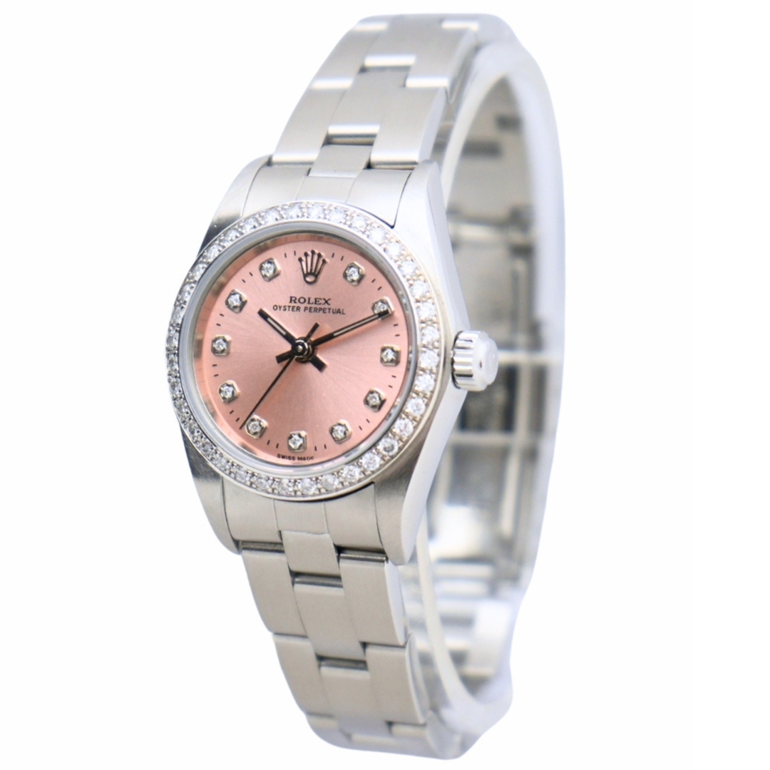 The salmon sunburst dial adds warmth and distinction, enhanced by afterset diamond hour markers that provide subtle brilliance against the metallic tone. Surrounding the dial is an aftermarket diamond-set bezel, adding visual impact and elevating the watch's overall presence. The stainless steel Oyster bracelet maintains a clean, balanced aesthetic while ensuring durability and comfort. Powering the watch is the Rolex Calibre 2230 automatic movement, a reliable and precise calibre designed specifically for smaller Oyster cases.