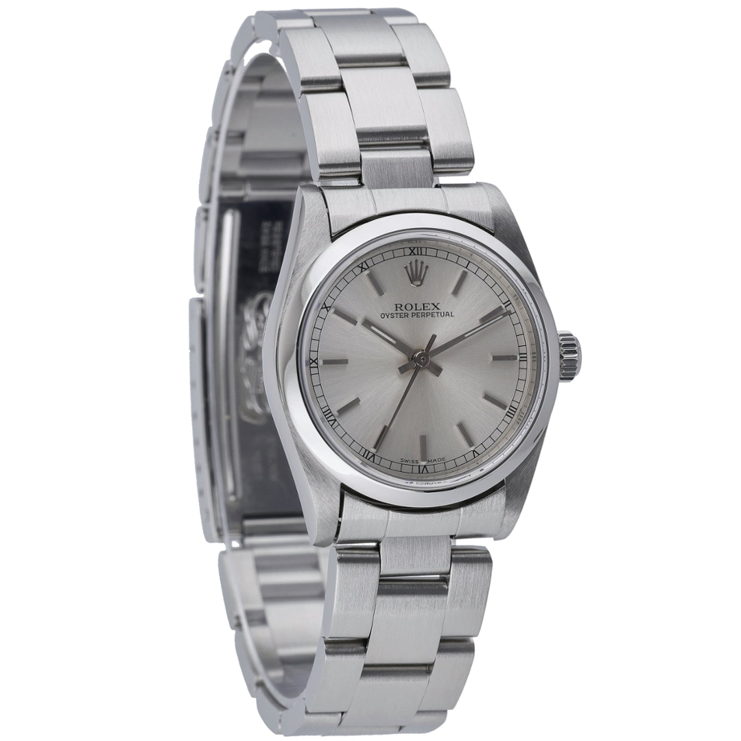 A Rolex Oyster Perpetual reference 77080 in stainless steel, featuring a deep Silver dial with applied baton hour markers. The clean dial layout, paired with the smooth bezel and Oyster bracelet, creates a timeless, versatile aesthetic, making this a well-balanced everyday Rolex with subtle character.