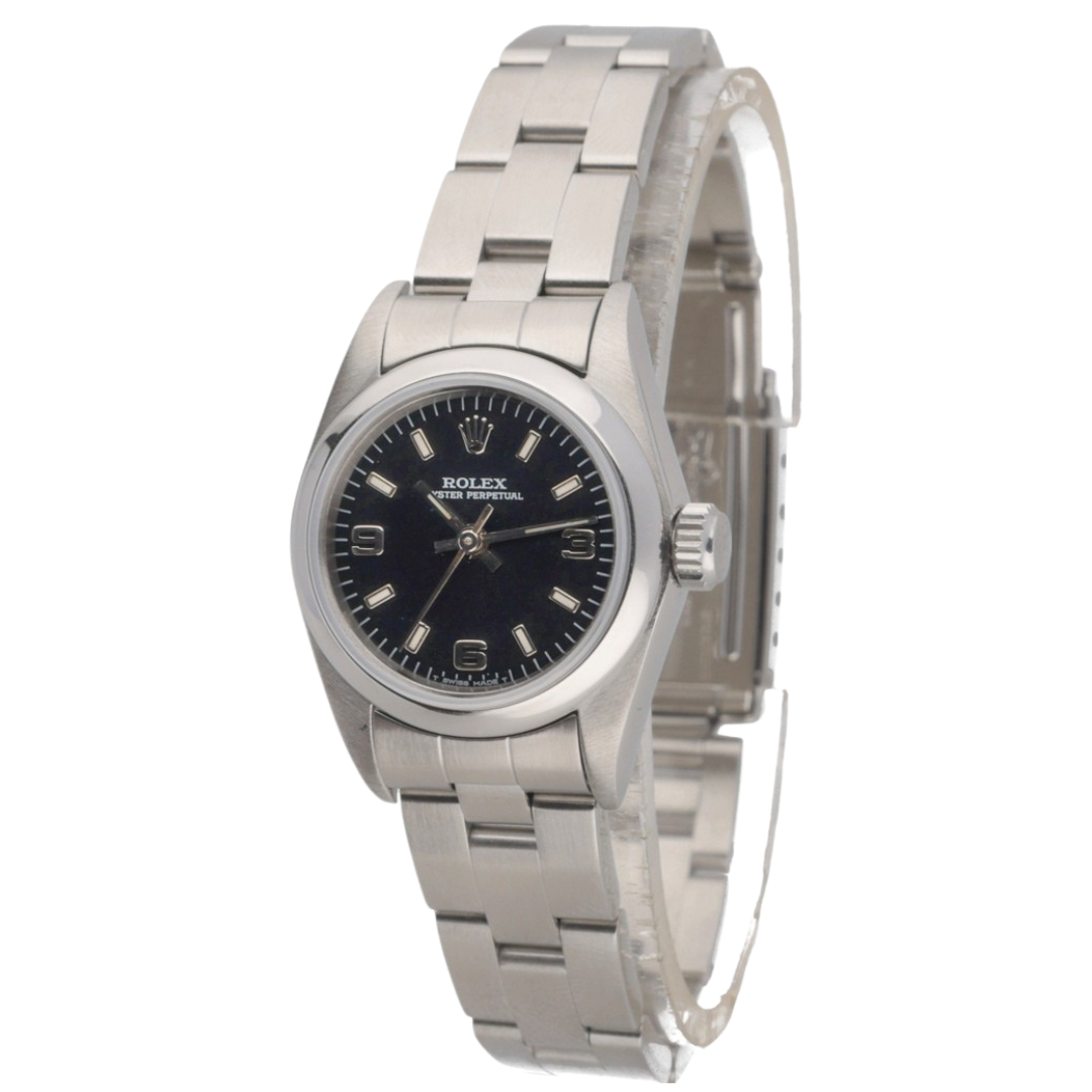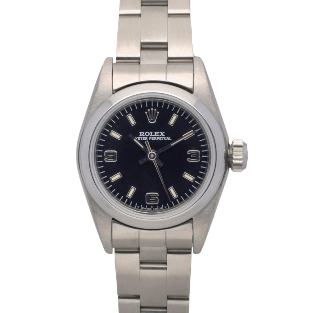 A Rolex Oyster Perpetual 67180, presented in a 24mm stainless steel Oyster case, offering a classic and understated entry into Rolex ownership. The black dial features applied baton hour markers and Arabic numerals at 3, 6, and 9, delivering a balanced, highly legible display. The smooth, domed bezel enhances the clean aesthetic, while the compact case size ensures a refined, versatile wrist presence suited to everyday wear.