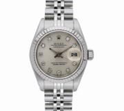 A Rolex Oyster Perpetual 76080 offers classic refinement with a bespoke finish. It features a 24mm stainless steel case enhanced by an elegant after-set diamond bezel. Its silver dial provides a clean, timeless aesthetic, maintaining the understated charm of the original design, while the diamond-set bezel adds a discreet yet luxurious touch.