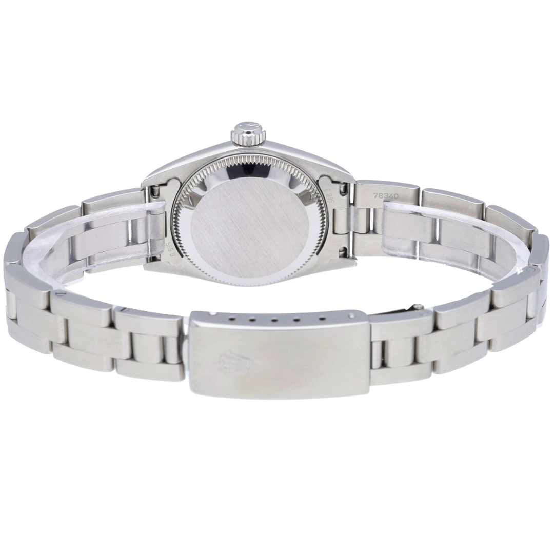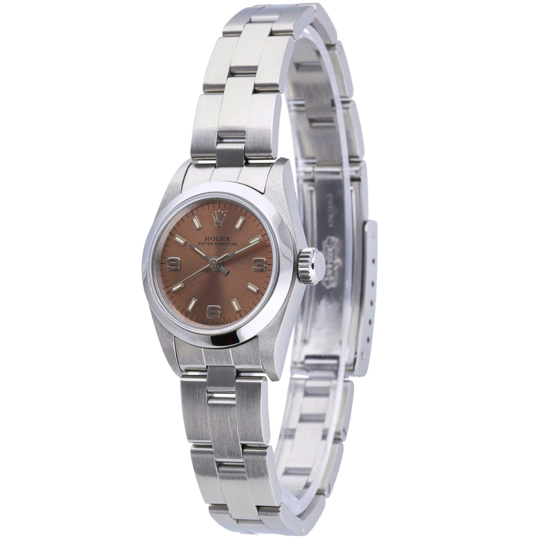 A Rolex Oyster Perpetual in stainless steel, presented with a highly desirable salmon-toned dial that offers a distinctive and understated aesthetic. The 26mm case delivers classic proportions, while the smooth bezel and Oyster bracelet maintain the model’s clean, versatile profile. The warm dial tone is complemented by applied Arabic and baton hour markers, creating a subtle contrast that enhances legibility.