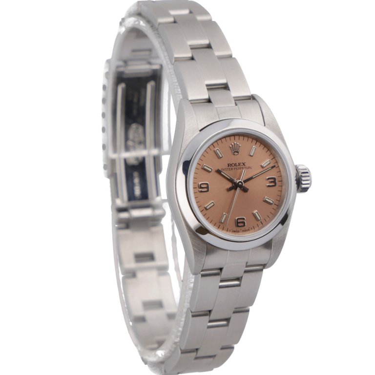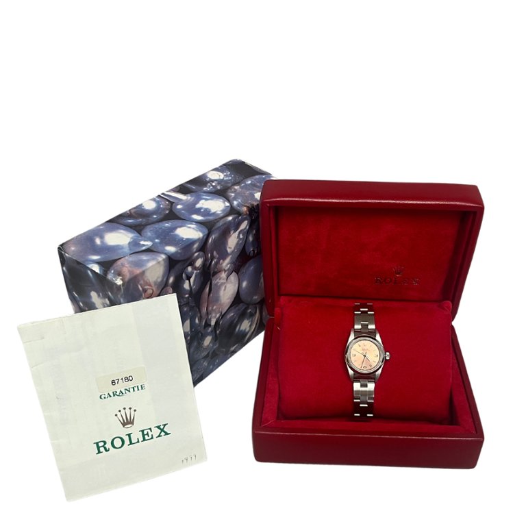 A Rolex Oyster Perpetual, model 67180, is presented in classic stainless steel with a compact 24mm case that offers both comfort and timeless versatility. The smooth bezel and Oyster bracelet create a clean, balanced aesthetic, allowing the standout salmon dial to take centre stage. Its warm tone adds a distinctive character rarely seen in this model, complemented by applied hour markers and Arabic numerals that enhance both charm and legibility.