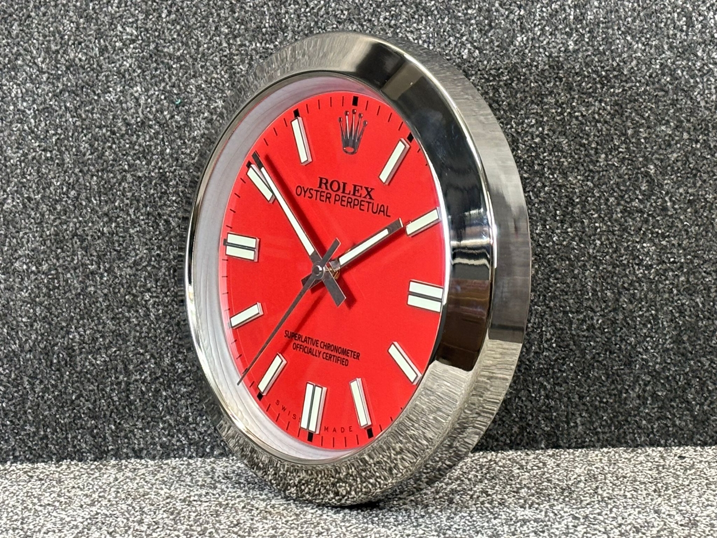 A stainless steel replica Rolex Oyster Perpetual wall clock, featuring a bold red dial that delivers a striking and contemporary take on a classic design. The clean, minimalist layout is complemented by baton-style hour markers and sleek hands, creating a strong visual presence while maintaining the timeless simplicity that defines the Oyster line.