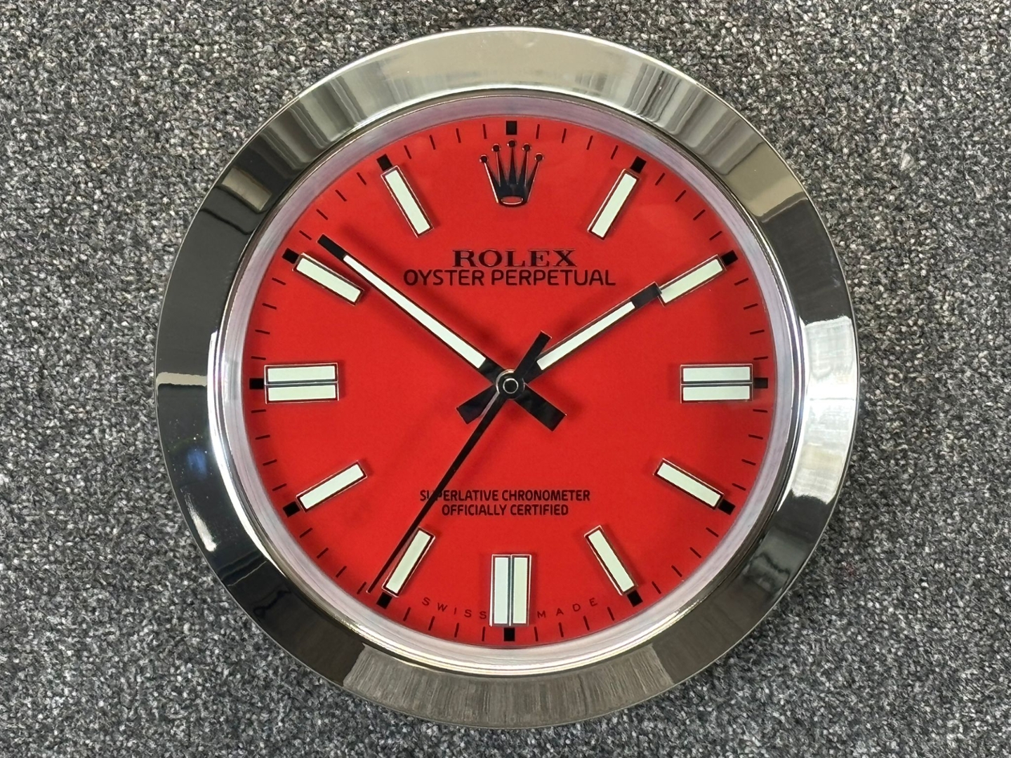 A stainless steel replica Rolex Oyster Red Dial Wall Clock with sweeping second hand and functional date. Approx 14" height, 14" width.