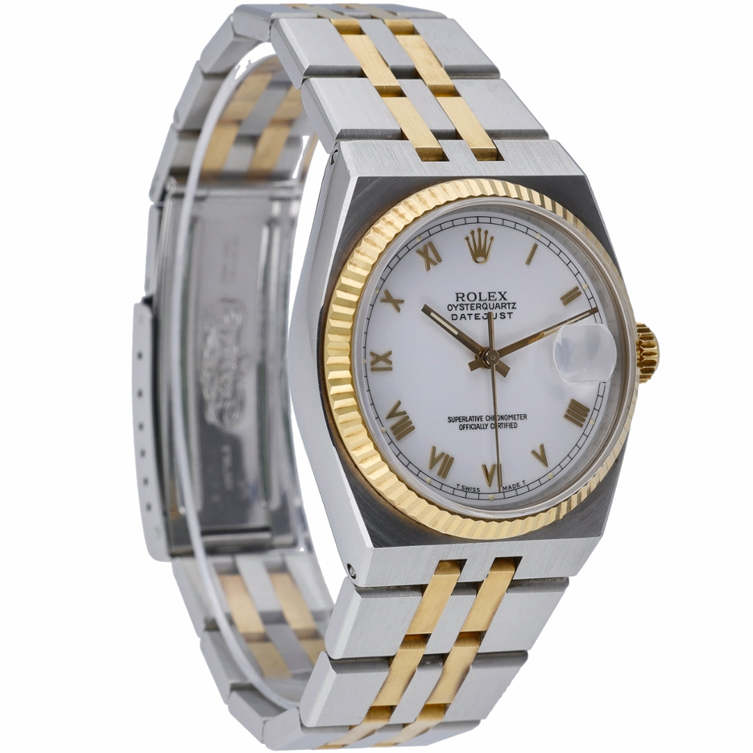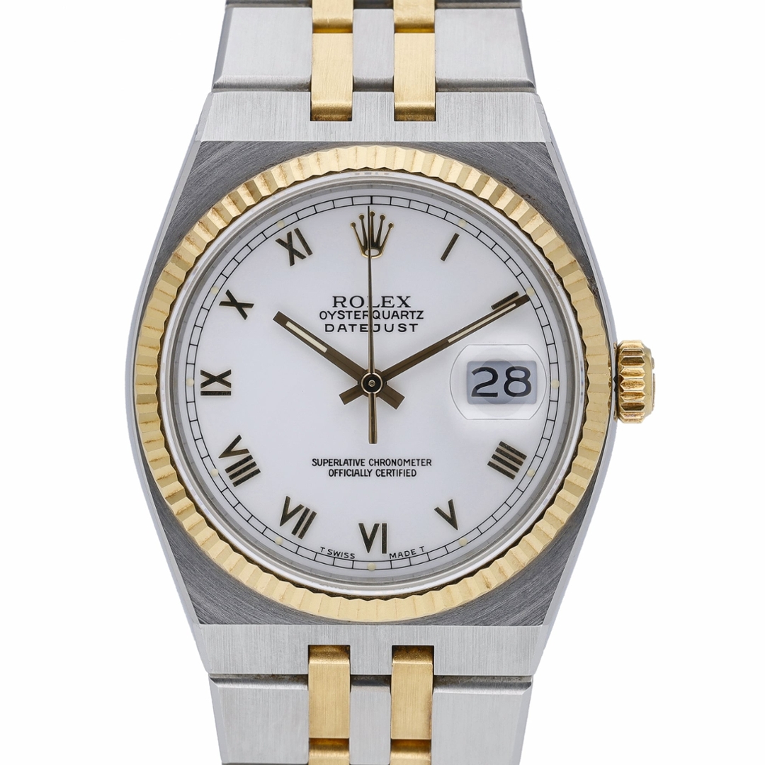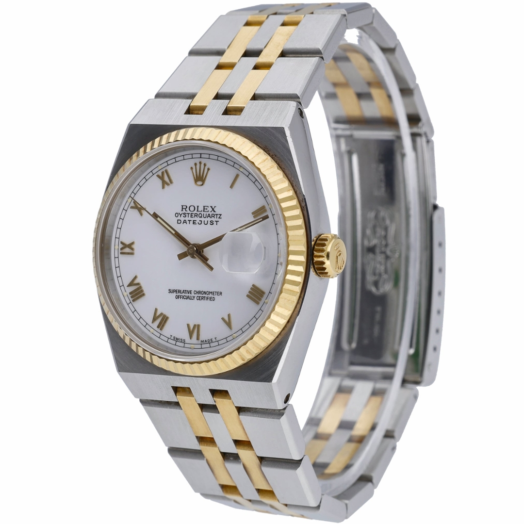 A Rolex Oysterquartz Datejust, model number 17013, is a unique timepiece that marries the precision of a quartz movement with Rolex's timeless style. Crafted in 1982, this watch features a 36mm case made from a striking combination of stainless steel and 18ct yellow gold, offering a luxurious yet robust appearance. The white dial, adorned with Roman numerals, enhances its classic appeal, making it a versatile piece suitable for formal occasions and everyday wear.