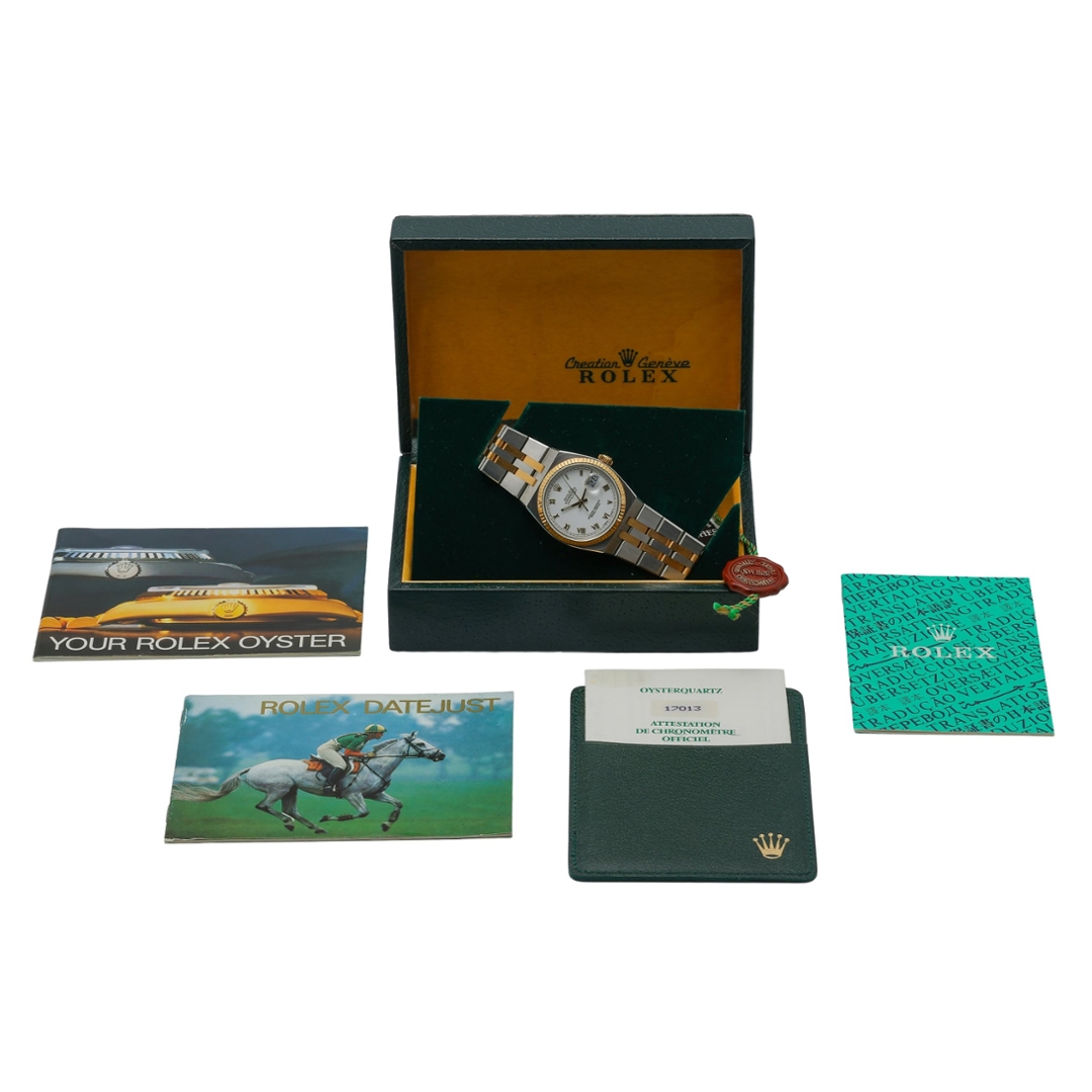 The watch is offered with a 12-month warranty from WLC, ensuring any servicing is covered and that it continues to operate at its best. Additionally, it comes fully boxed and certified, which secures the watch during transportation and enhances its collectibility. Including original paperwork certifies its authenticity and lineage, making it a valuable addition to any collection. The bimetal Rolex Oysterquartz Datejust is not just a timepiece but a piece of history, blending innovation with traditional Rolex craftsmanship.