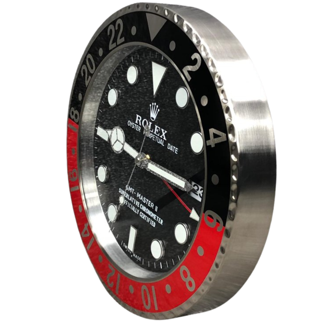 a Rolex GMT-Master II, designed to elevate any space with its sophisticated charm. The clock features a sleek black face, complemented by the signature red and black bezel