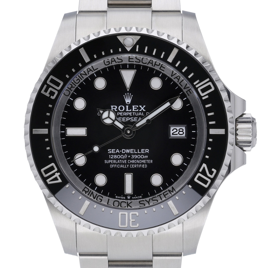 A Rolex Sea-Dweller Deepsea 136660 is presented here in stainless steel, featuring the distinctive black dial and matching Cerachrom bezel that define this extreme professional dive watch. The 44mm Oyster case is engineered for saturation diving, incorporating Rolex’s Ringlock System and helium escape valve, delivering water resistance rated to an extraordinary 3,900 metres. The bold dial layout ensures exceptional legibility in the most demanding environments.