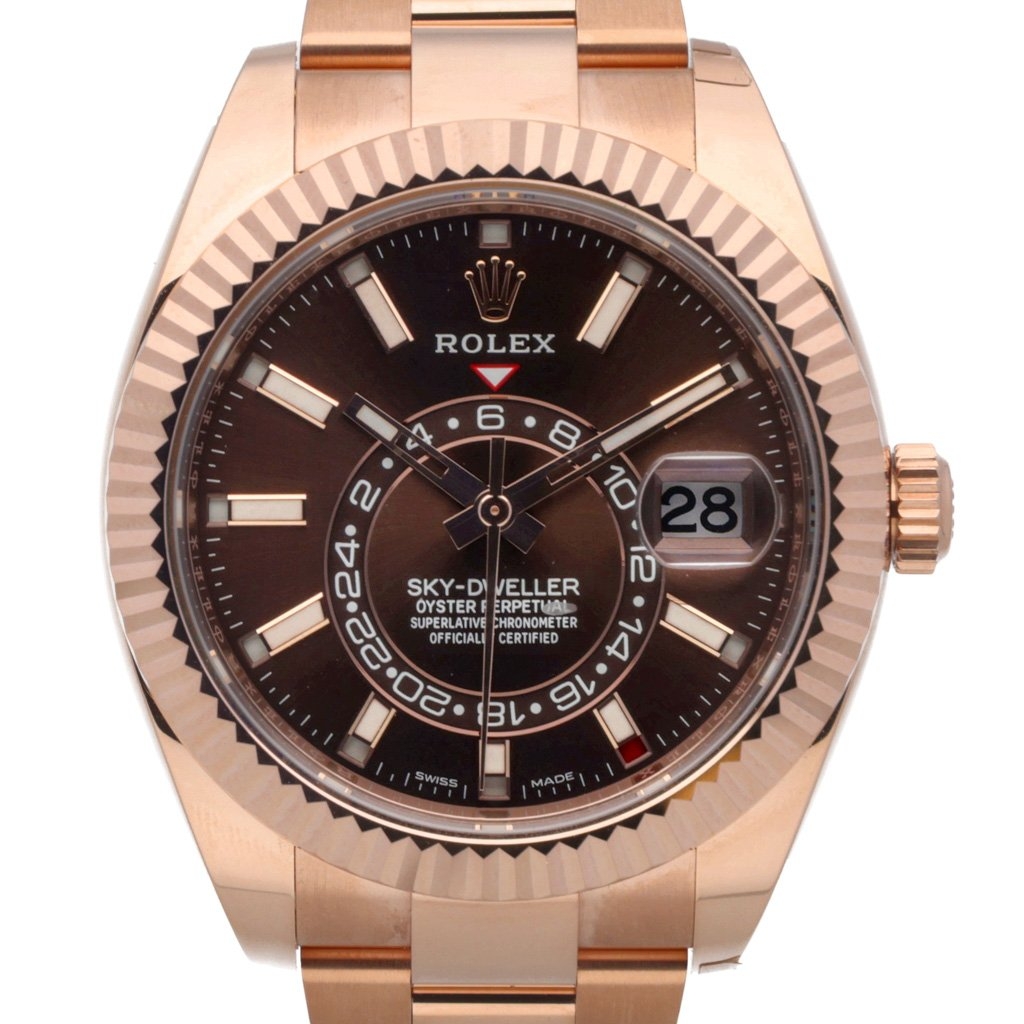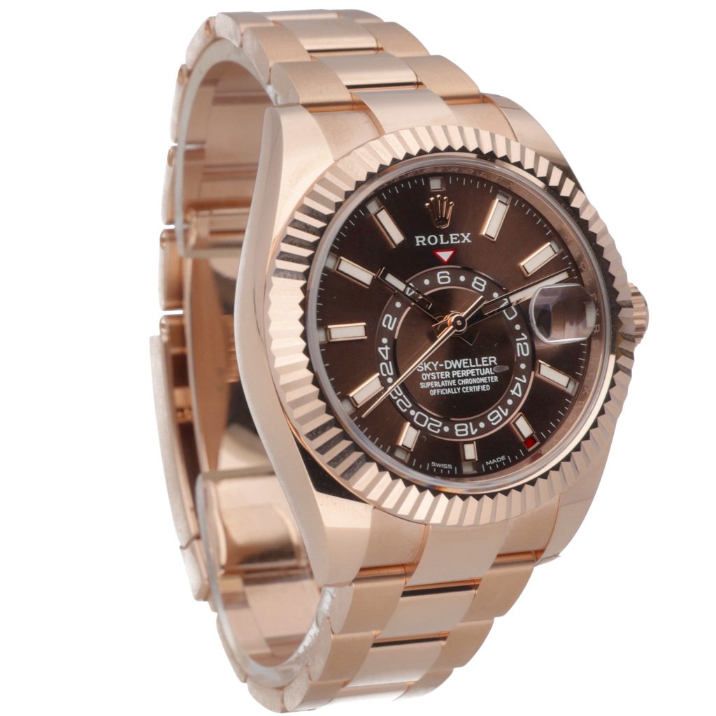 A Rolex Sky-Dweller Watch, crafted entirely from 18ct Everose gold, featuring a distinctive Chocolate Brown Dial that perfectly complements the warm tones of the case.