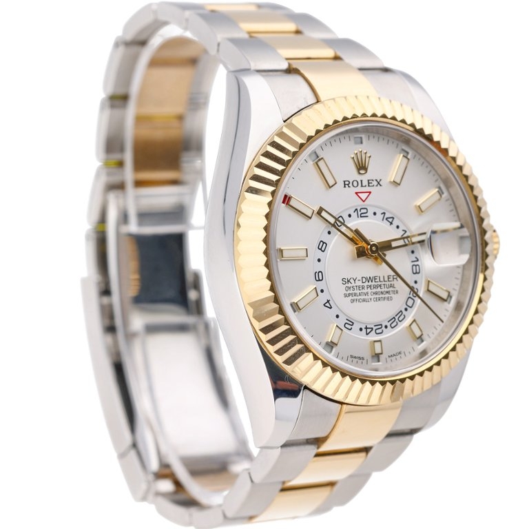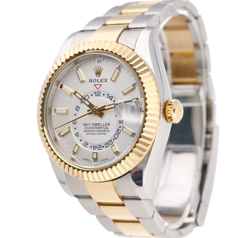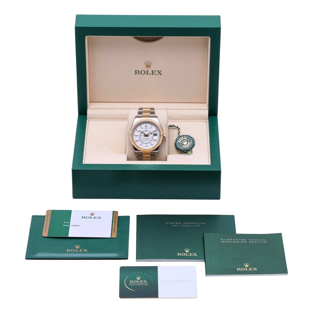 A Bi-Metal Rolex Sky-Dweller Watch, expertly crafted from stainless steel and 18ct yellow gold, embodies the pinnacle of horological innovation and sophistication. This impressive 42mm reference 326933, dated 2019, features a crisp white dial elegantly contrasted by luminous hands and bold Roman numeral hour markers, housed beneath a fluted yellow gold bezel—a signature Rolex detail.