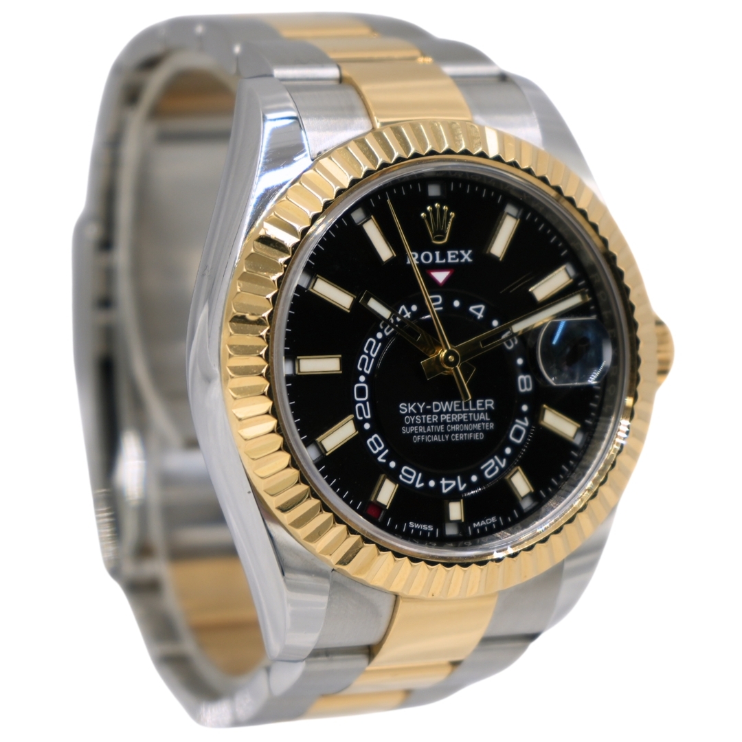 A Bi-Metal Rolex Sky-Dweller (Model: 326933), introduced in 2021, is designed with the discerning customer in mind, offering a perfect blend of luxury, precision, and practicality. Its 42mm case, crafted from stainless steel and 18ct yellow gold, ensures durability while exuding a timeless elegance. The black dial provides a striking, modern contrast to the polished hour markers and hands, ensuring legibility even in low-light conditions.