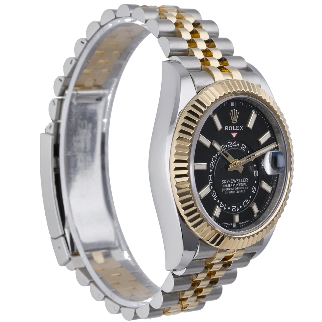 A bi-metal Rolex Sky-Dweller Watch, a fusion of stainless steel and 18ct yellow gold, exudes sophistication and refinement. Featuring a sleek black dial, this timepiece is both striking and elegant, making a bold statement on the wrist.
