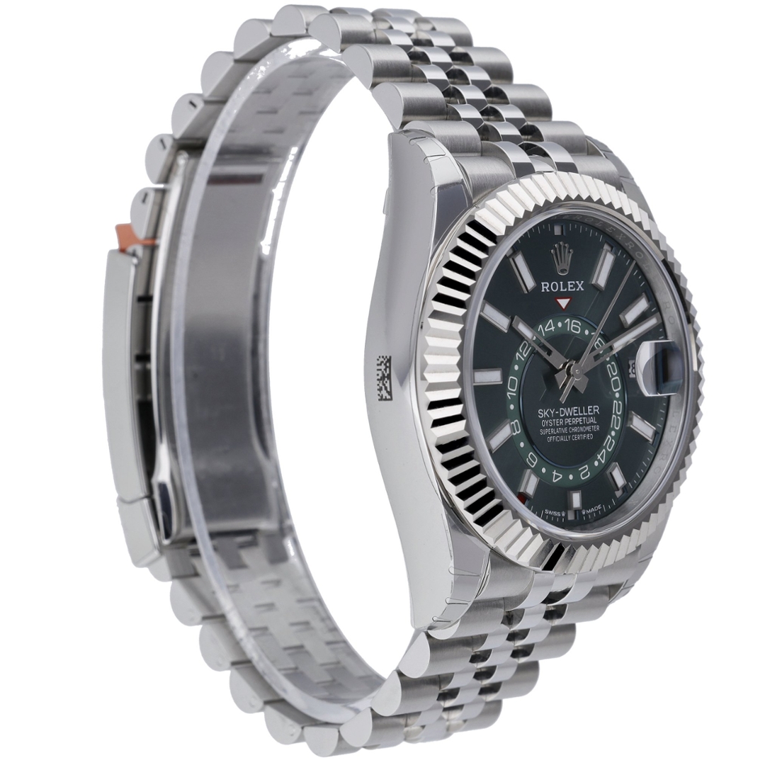 A Rolex Sky-Dweller Watch, Stainless Steel with an 18ct White Gold Bezel and a Green Dial.
