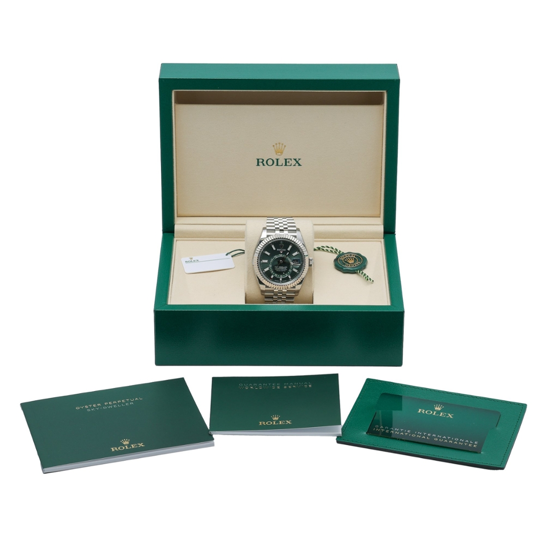 This 2025 example remains immaculate, unworn, and still with stickers, accompanied by its original complete set of Rolex paperwork, presentation box, and manufacturer warranty valid until 2030. A truly exceptional piece for collectors and connoisseurs alike, the Sky-Dweller Green Dial continues to be one of Rolex’s most coveted releases—bold, brilliant, and beautifully engineered for those who live life without limits.
