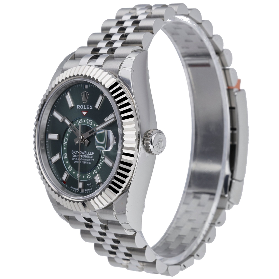 A Rolex Sky-Dweller 336934, crafted from stainless steel and crowned with an 18ct white gold fluted bezel, paired perfectly with a striking green dial that radiates contemporary prestige. One of the most technically sophisticated watches in the Rolex lineup, the Sky-Dweller masterfully combines dual-time functionality with an annual calendar—an ingenious design for those who travel the world yet value precision and elegance.