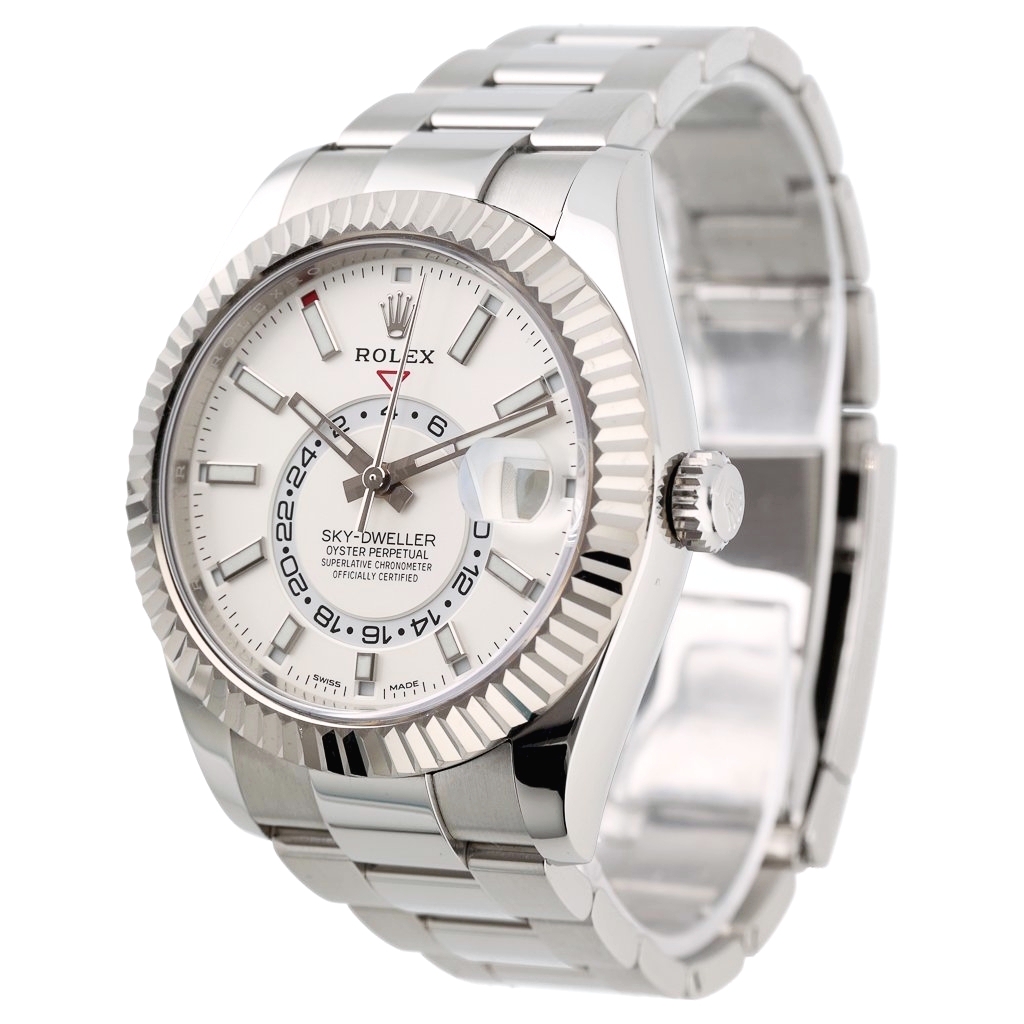 A Rolex Sky-Dweller is a masterpiece of engineering and elegance, designed for those who appreciate the finest in horology. This 2021 model showcases an exquisite blend of stainless steel and 18ct white gold, offering a perfect balance of durability and luxury. The 18ct white gold fluted bezel enhances its distinguished appearance, framing the pristine white dial, which exudes sophistication and clarity. With a 42mm case size, the watch commands attention on the wrist while maintaining Rolex’s signature refinement.