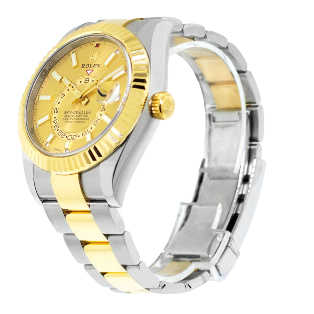 A superb example of the latest-generation Bi-Metal Rolex Sky-Dweller, this 2024 reference 336933 pairs stainless steel and 18ct yellow gold with a striking champagne dial, giving the watch an undeniably luxurious presence. The signature fluted bezel — crafted entirely from solid yellow gold — surrounds an elegant sunburst display that presents dual time-zone functionality and the annual calendar in Rolex’s most refined form. The colour combination feels warm, modern, and exceptionally premium on the wrist.