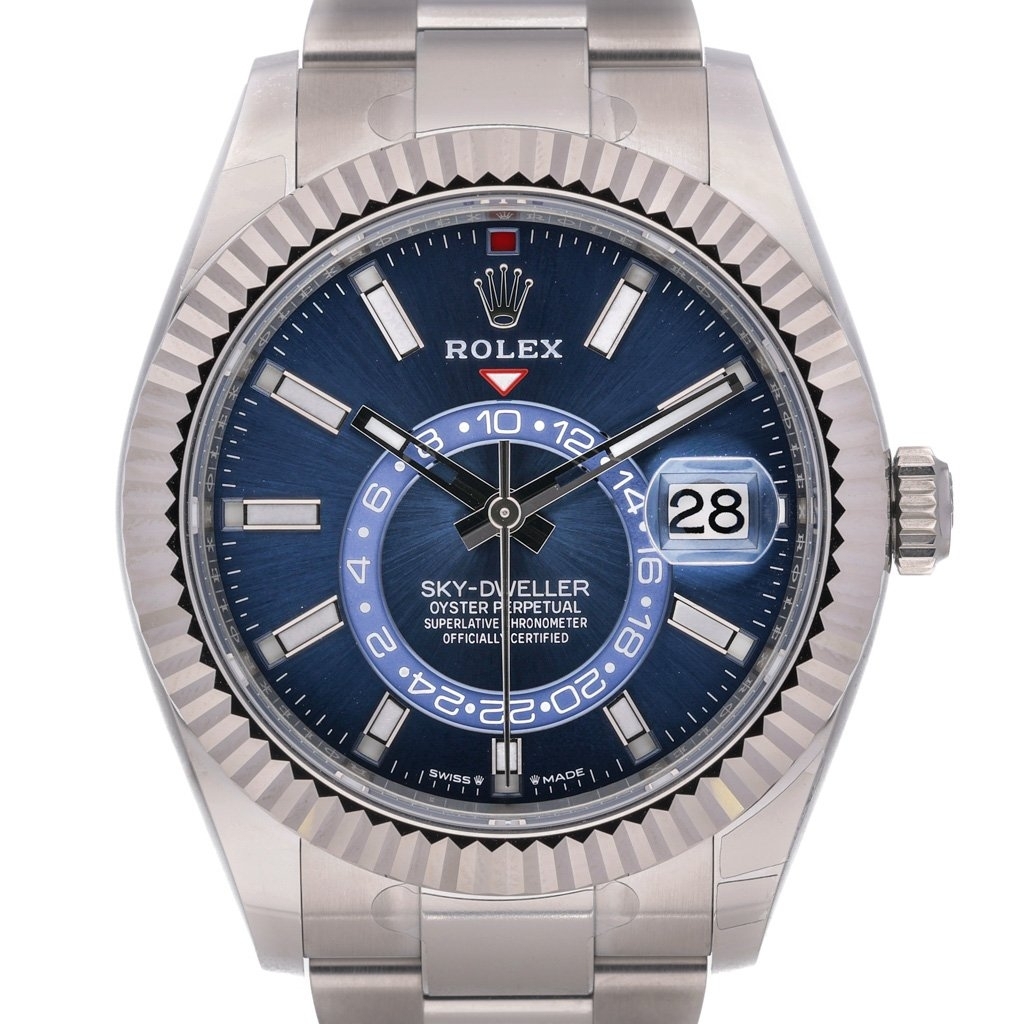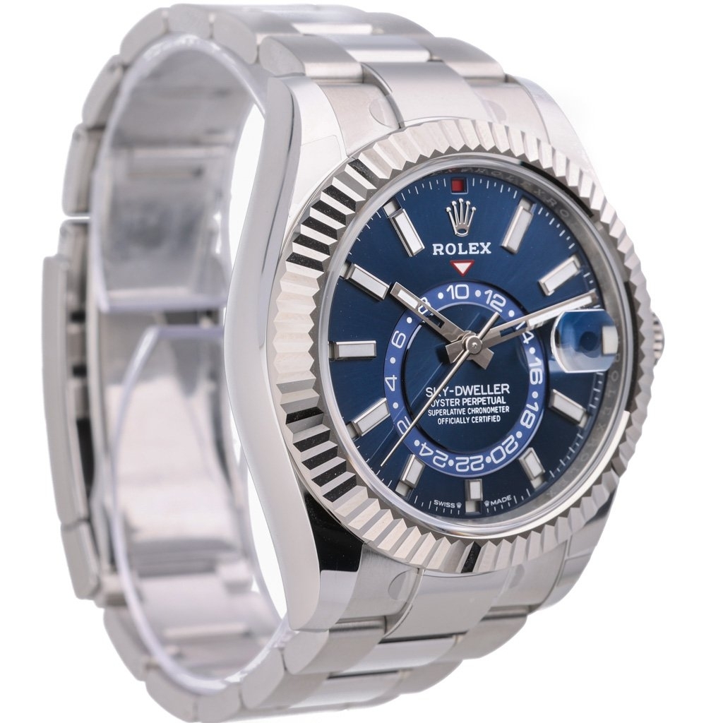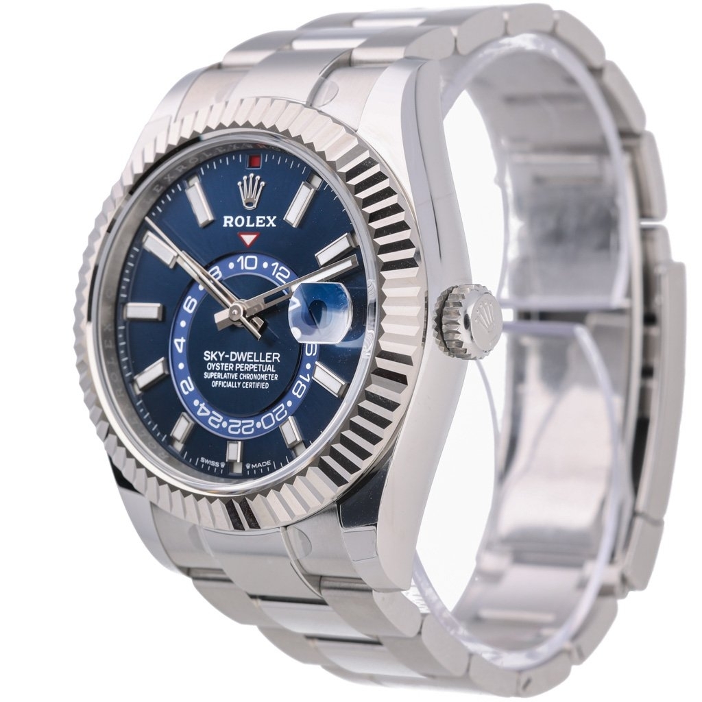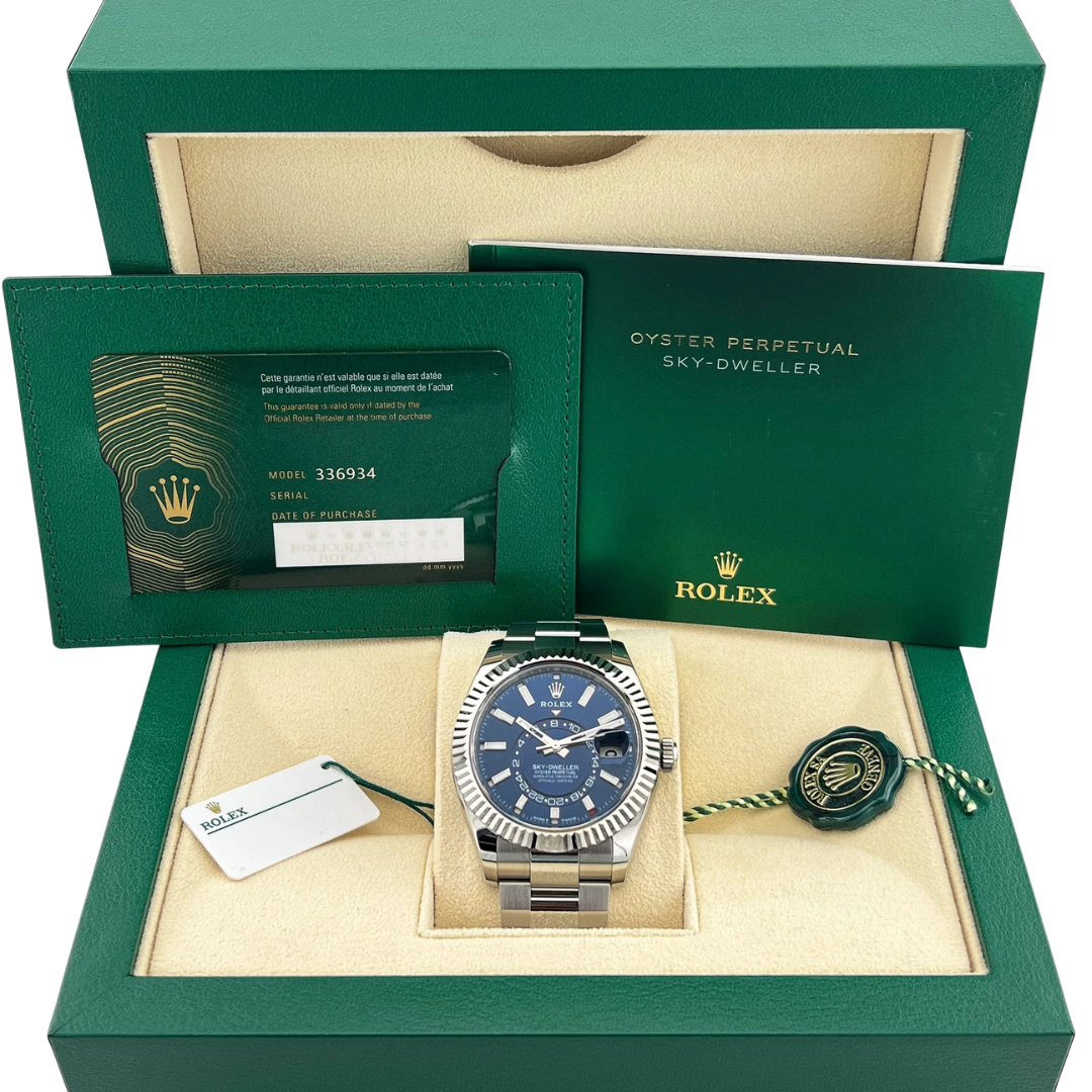 A Rolex Sky-Dweller Watch, model 336934, presented in immaculate condition. This 2024 reference is crafted from stainless steel and features an 18ct white gold fluted bezel. It features the highly sought-after blue dial, showcasing the Sky-Dweller’s signature dual-time display and annual calendar. Housed in a 42mm case, it is powered by the Rolex Calibre 9002 automatic movement. It is supplied as a full set, complete with the original box, paperwork, and a Rolex manufacturer's warranty valid until 2029.
