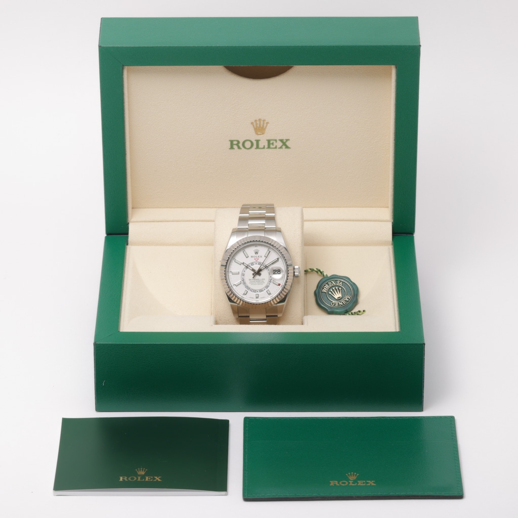 This Rolex Sky-Dweller 326934 combines stainless steel with 18ct white gold to create a modern and versatile expression of Rolex’s most advanced annual calendar and dual-time wristwatch. The 42mm case is matched with an intense white dial that offers exceptional clarity, featuring a 24-hour off-centre disc, luminous markers and the characteristic month display aperture highlighted in red. The white gold fluted bezel remains a defining aesthetic and functional element, integrating perfectly with the Ring Command system to adjust the watch’s multiple complications with ease.