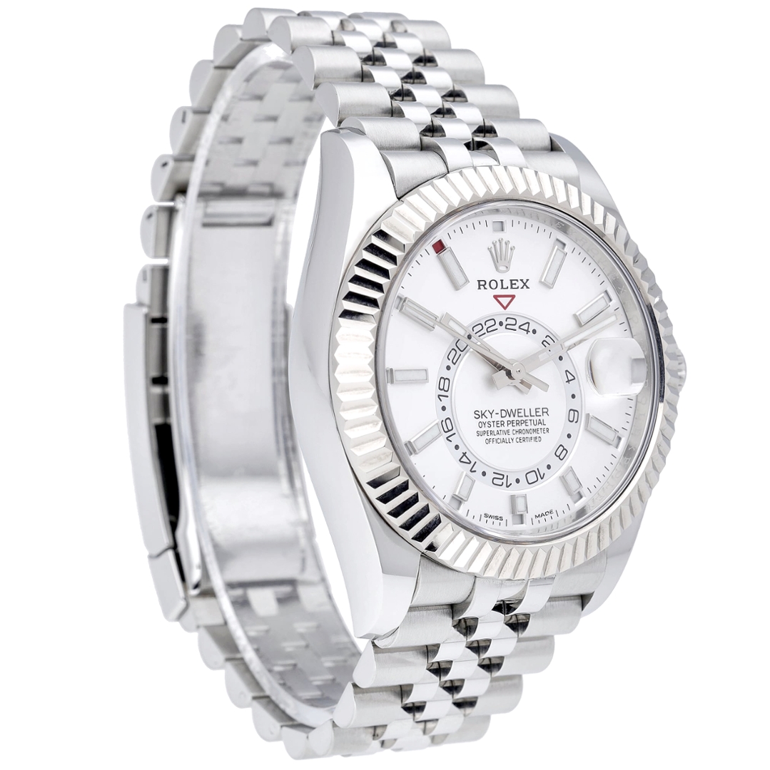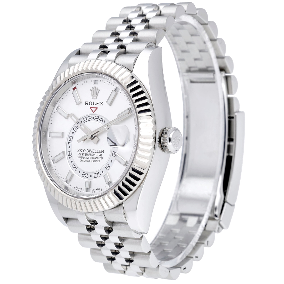 A Rolex Sky-Dweller, model 326934, crafted in stainless steel with an 18ct white gold fluted bezel, stands as one of the most technically advanced and visually striking timepieces in the Rolex collection.
