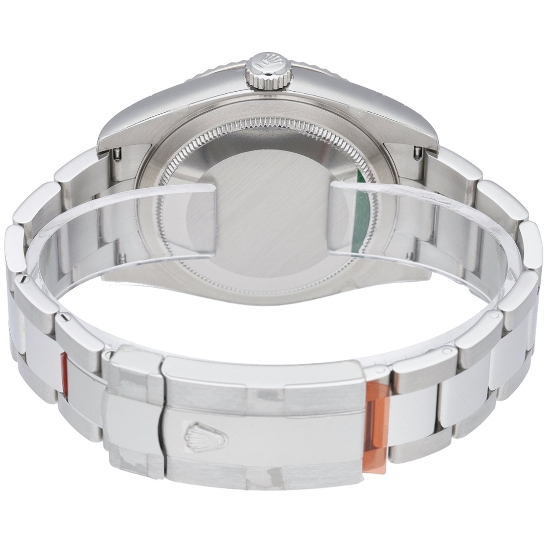 Powered by the Rolex Calibre 9001 automatic movement, the Sky-Dweller features an annual calendar with Saros system, dual time zone display, and a month indicator integrated into the dial — all controlled by the innovative Ring Command bezel. The black dial is clean and legible, enhanced by luminous baton markers, a red 24-hour GMT disc, and the signature Cyclops date display.