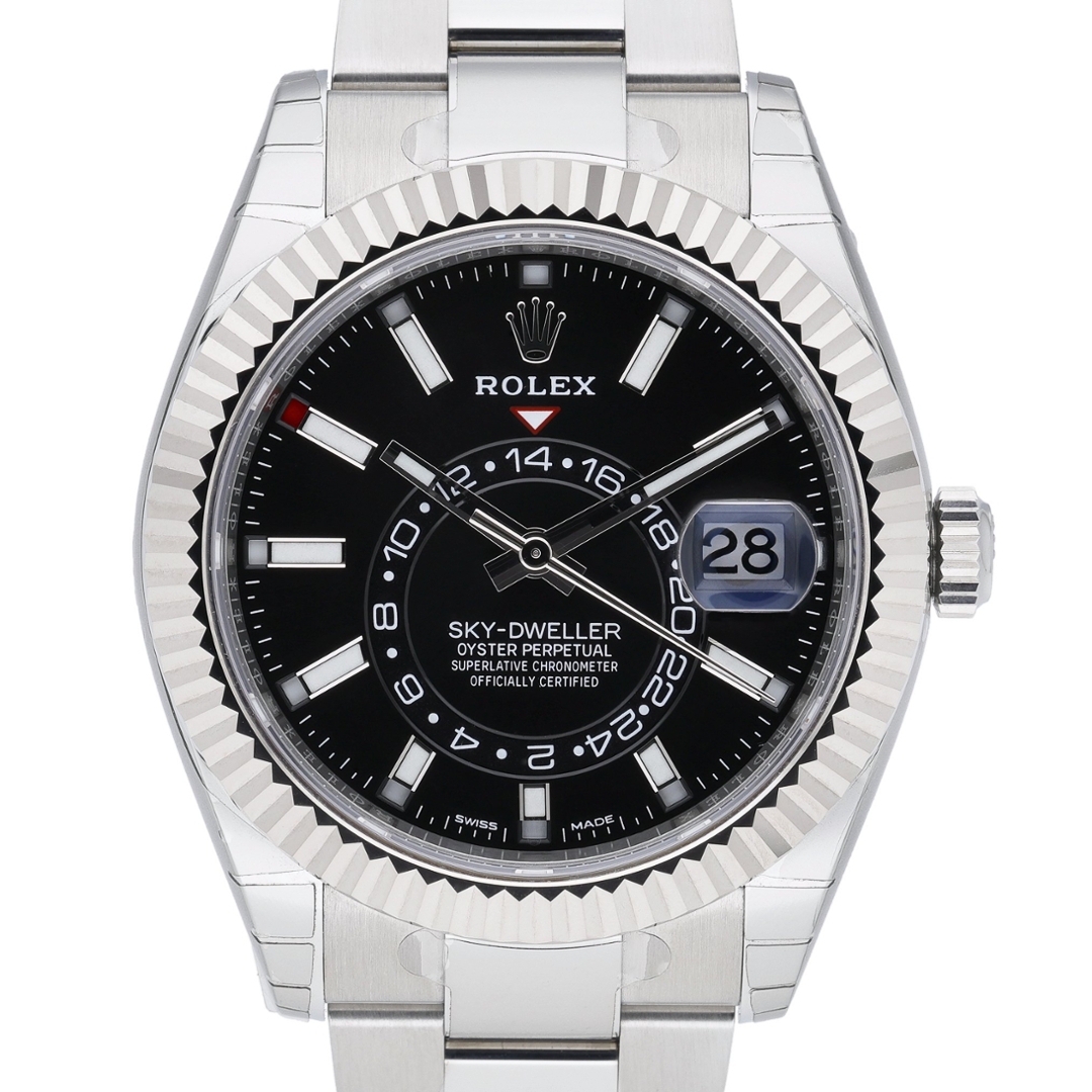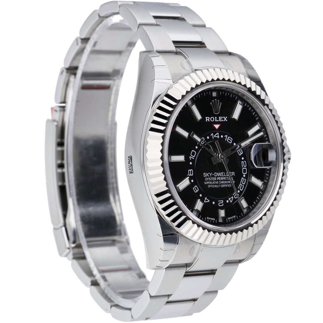 A Rolex Sky-Dweller 326934, crafted in stainless steel and featuring an 18ct white gold fluted bezel with a sleek black dial — a bold, refined combination in one of Rolex’s most technically sophisticated models. With a 42mm Oyster case and commanding profile, this reference pairs advanced function with unmistakable Rolex elegance.