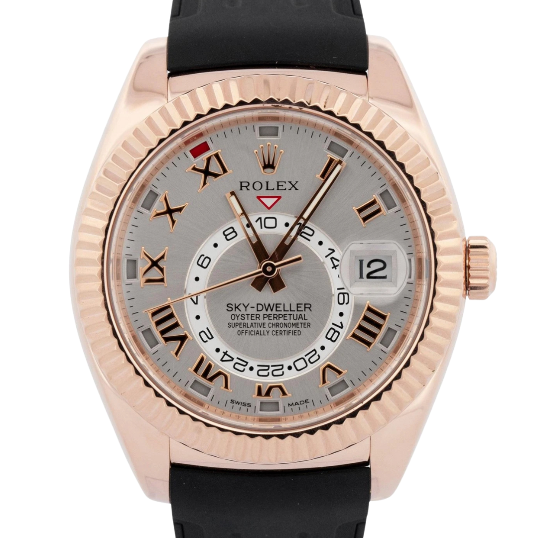 This Rolex Sky-Dweller reference 326135 is crafted in full 18ct Everose gold and paired with a distinctive Sundust dial featuring applied Roman numerals. The 42mm case is fitted with Rolex’s Ring Command fluted bezel, allowing intuitive adjustment of its advanced calendar and dual time functions while maintaining a refined, contemporary presence on the wrist.