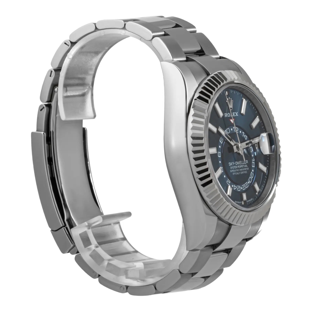 A Rolex Sky-Dweller Watch, model 336934, presented in immaculate condition. This 2025 reference is crafted from stainless steel and features an 18ct white gold fluted bezel. It features the highly sought-after blue dial, showcasing the Sky-Dweller’s signature dual-time display and annual calendar. Housed in a 42mm case, it is powered by the Rolex Calibre 9002 automatic movement. It is supplied as a full set, complete with the original box, paperwork, and a Rolex manufacturer's warranty valid until 2030.