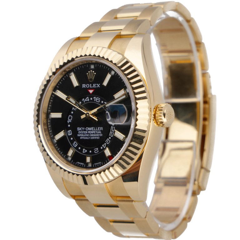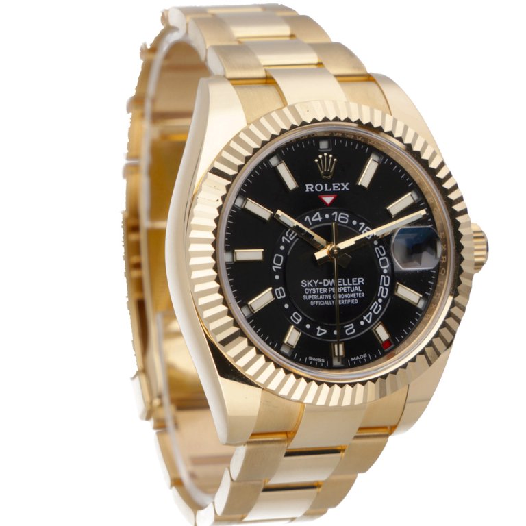 A Rolex Sky-Dweller reference 326938 in full 18ct yellow gold, featuring a commanding 42mm case and striking black dial. The fluted Ring Command bezel works seamlessly with the annual calendar and dual time display, offering both presence and practicality. The rich gold Oyster bracelet completes a configuration that remains one of the most sought-after in the Sky-Dweller range.