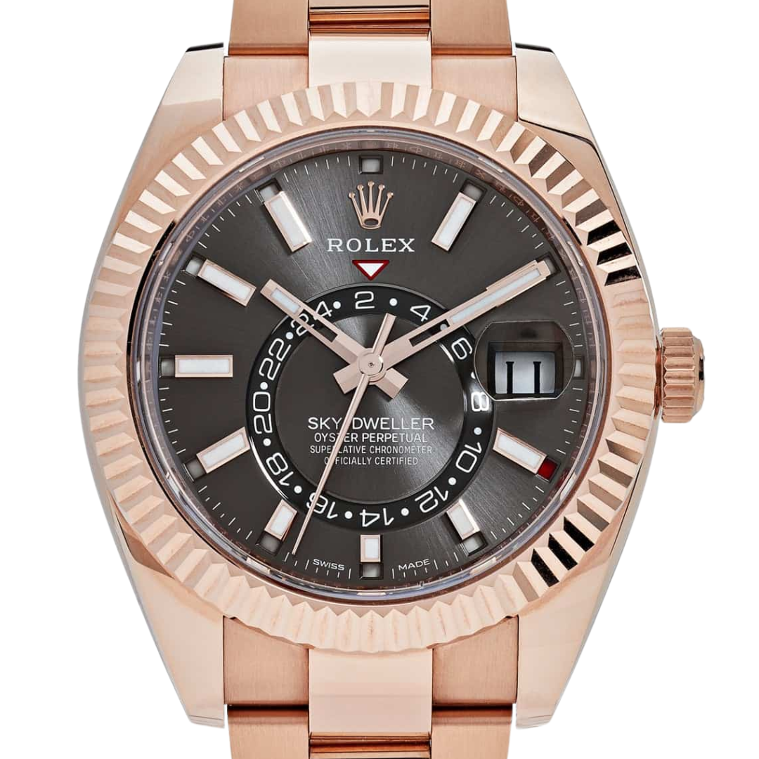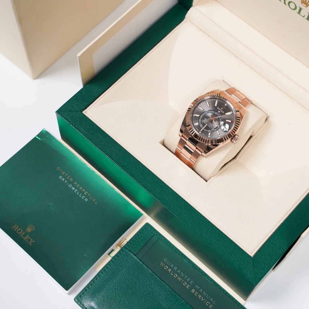 A Rolex Sky-Dweller reference 326935 in full 18ct Everose gold, featuring a 42mm Oyster case with a fluted Everose gold bezel and matching Oyster bracelet. The slate grey dial is complemented by applied baton hour markers and polished hands with Chromalight display, while the off-centre 24-hour disc and annual calendar apertures add depth and a highly recognisable layout.