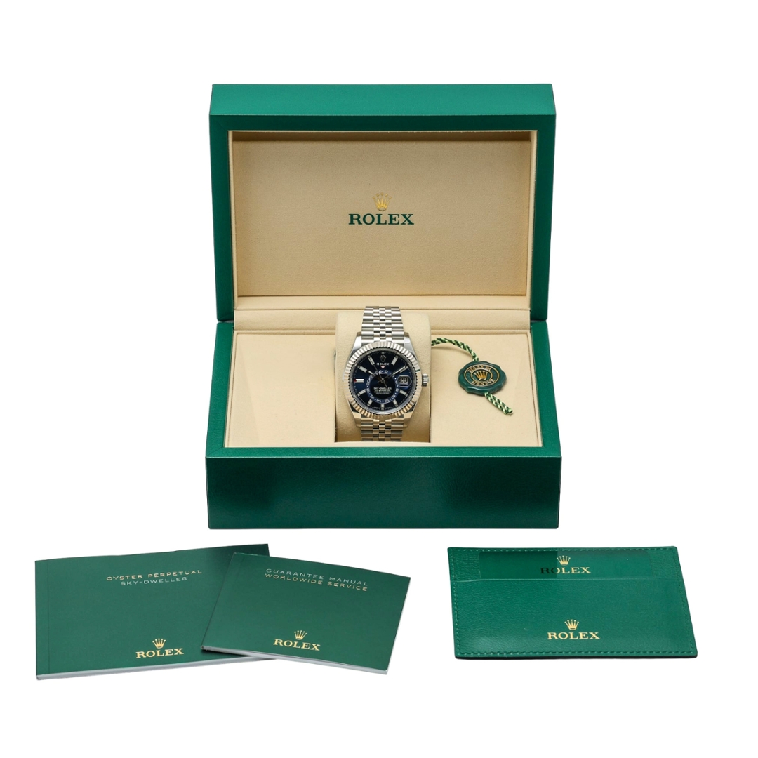 Supplied as a complete full set, the watch includes its original box, certification and complete paperwork. With its advanced movement, elegant bezel detailing and distinctive blue dial, the 336934 stands out as a sophisticated and competent addition to the modern Sky-Dweller collection.