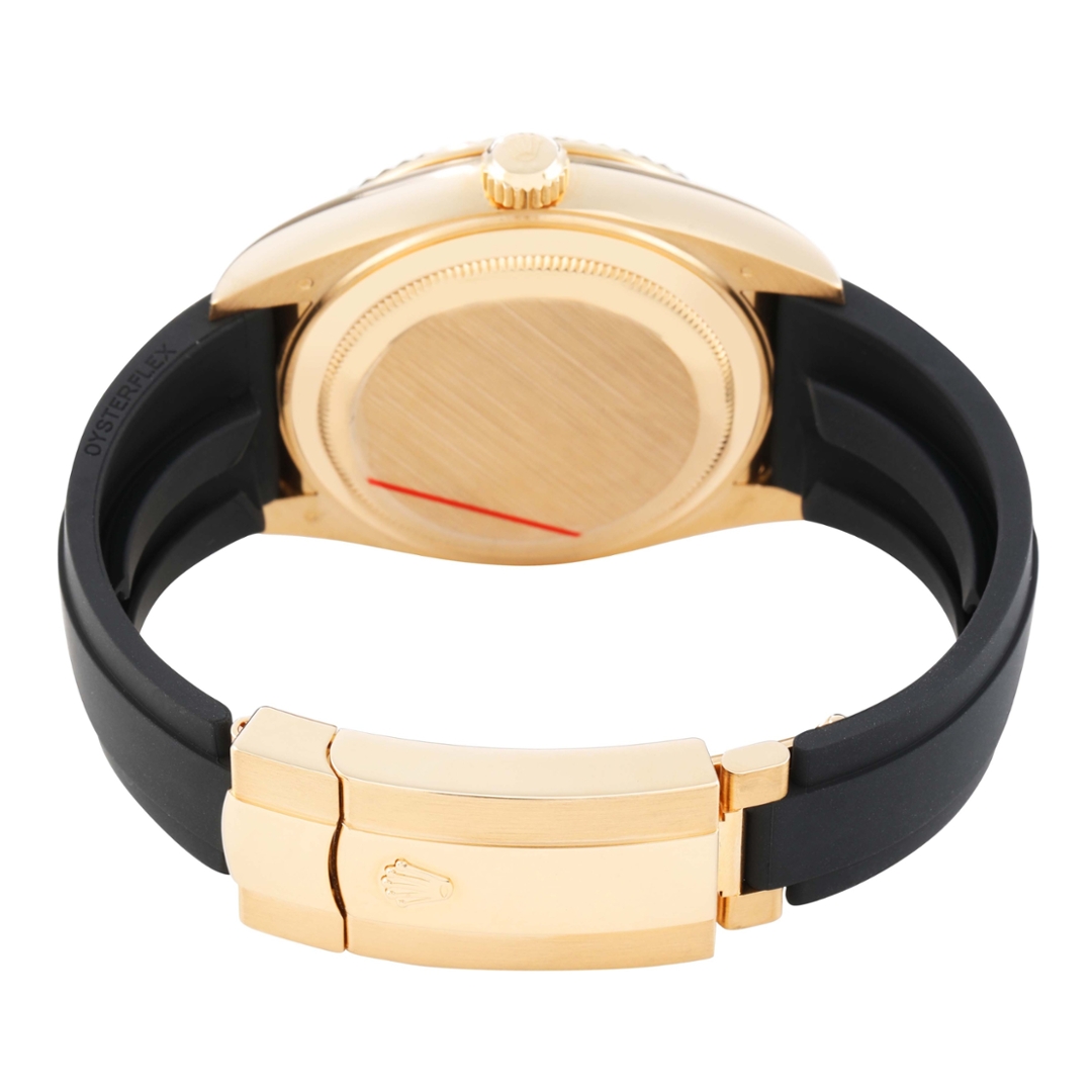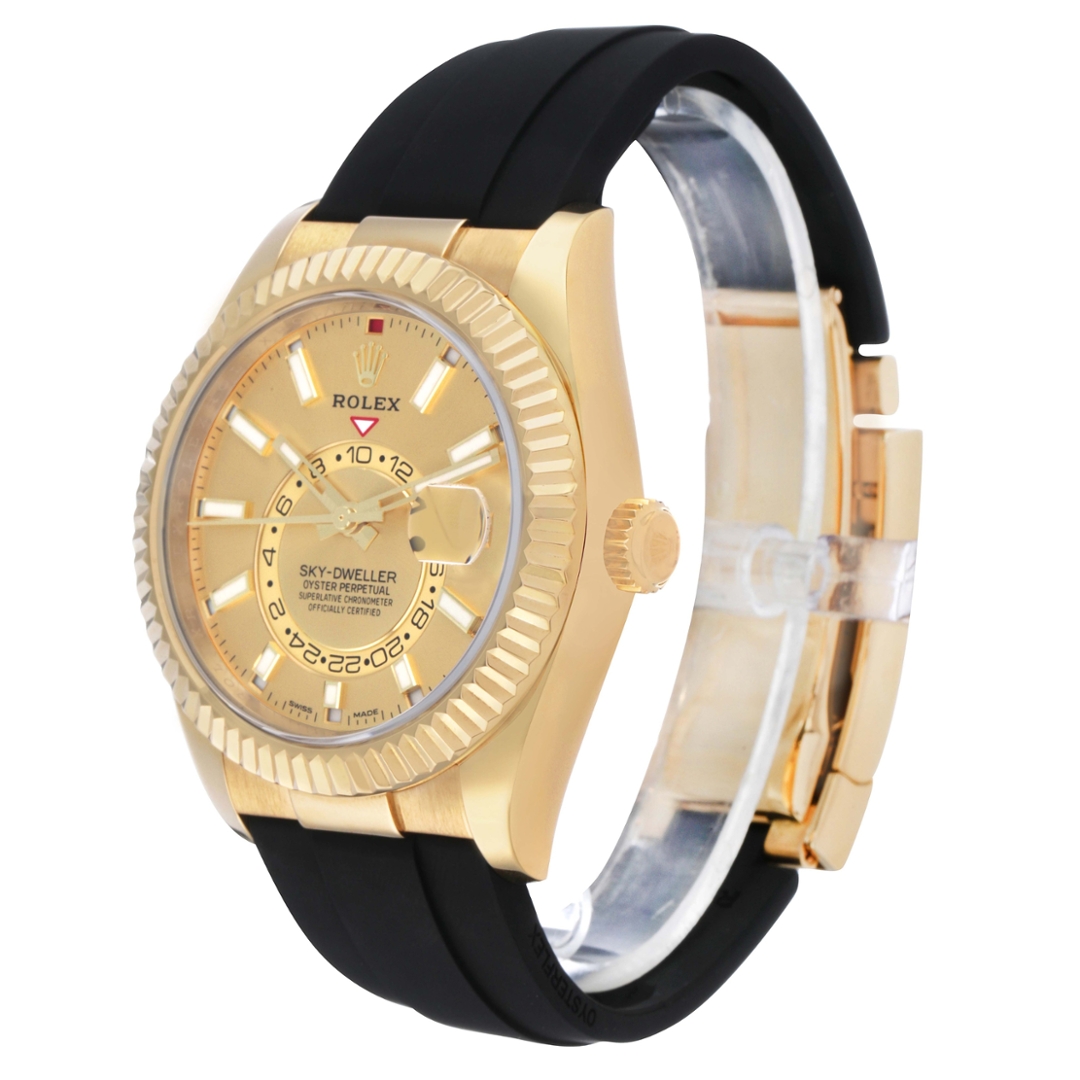 A Rolex Sky-Dweller reference 326238 in full 18ct yellow gold, fitted to a black Oysterflex bracelet with a matching yellow gold clasp and presented on a champagne dial. This 2021 example is offered in immaculate condition and combines the prestige of precious metal with the contemporary sport-luxury feel of the Oysterflex configuration. The commanding fluted bezel complements the 42mm case, while the champagne dial provides a glowing appeal against the warmth of yellow gold, delivering a strong wrist presence with refined balance.