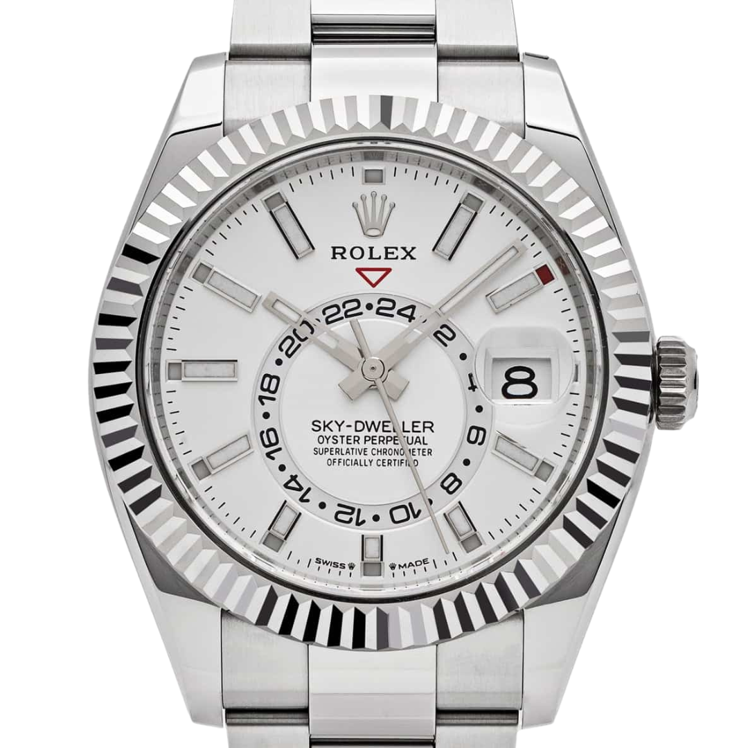 A Rolex Sky-Dweller reference 336934 in stainless steel and 18ct white gold, presented with a crisp, highly legible, intense white dial. As one of Rolex’s most advanced timepieces, the Sky-Dweller seamlessly integrates dual time functionality with an annual calendar, offering both technical sophistication and everyday usability in a refined package.