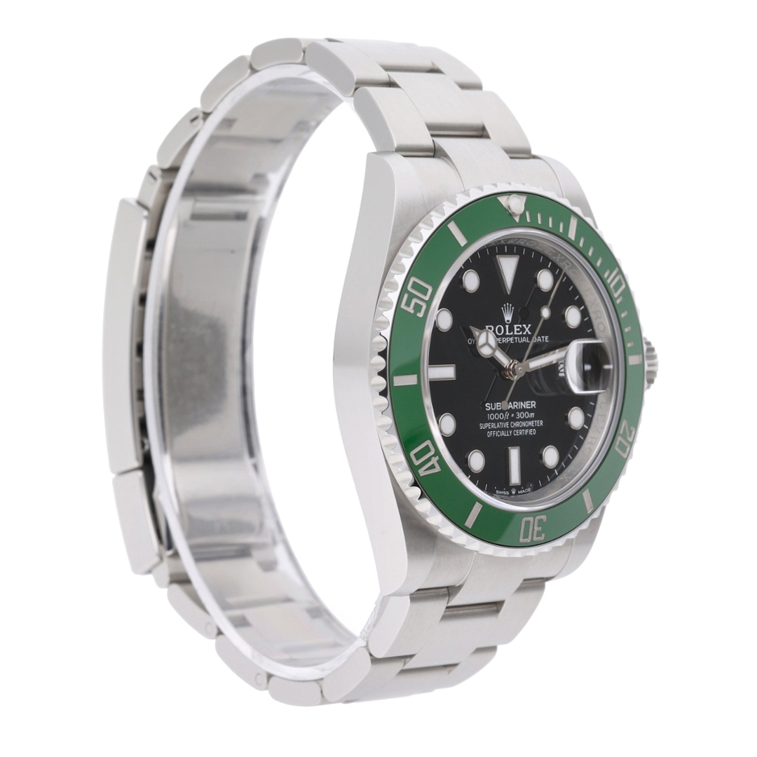 A Rolex Submariner Watch, Stainless Steel with a Green Bezel and Black Dial.