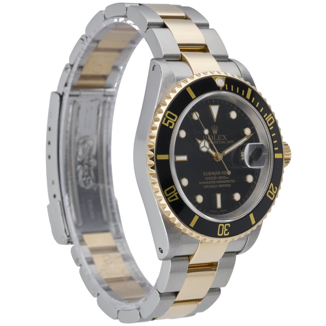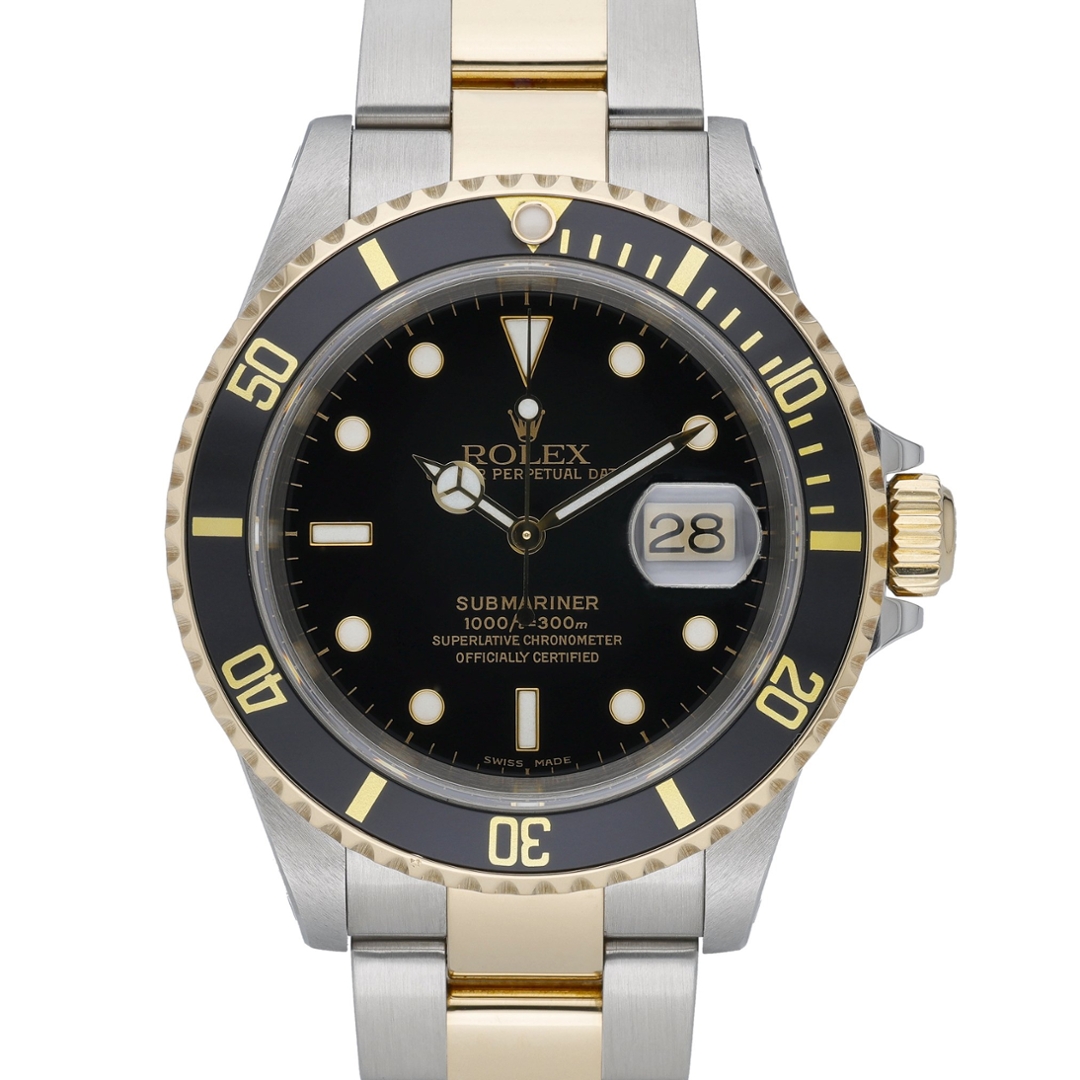 A Bi-Metal Rolex Submariner Watch that perfectly embodies the fusion of strength and sophistication, crafted from robust stainless steel and luxurious 18ct yellow gold. The striking combination is complemented by a deep black dial and matching black bezel, giving this timepiece its signature, timeless appeal. The luminous hour markers and hands ensure outstanding legibility in all conditions, while the 40mm case offers a bold yet balanced wrist presence suitable for any occasion.