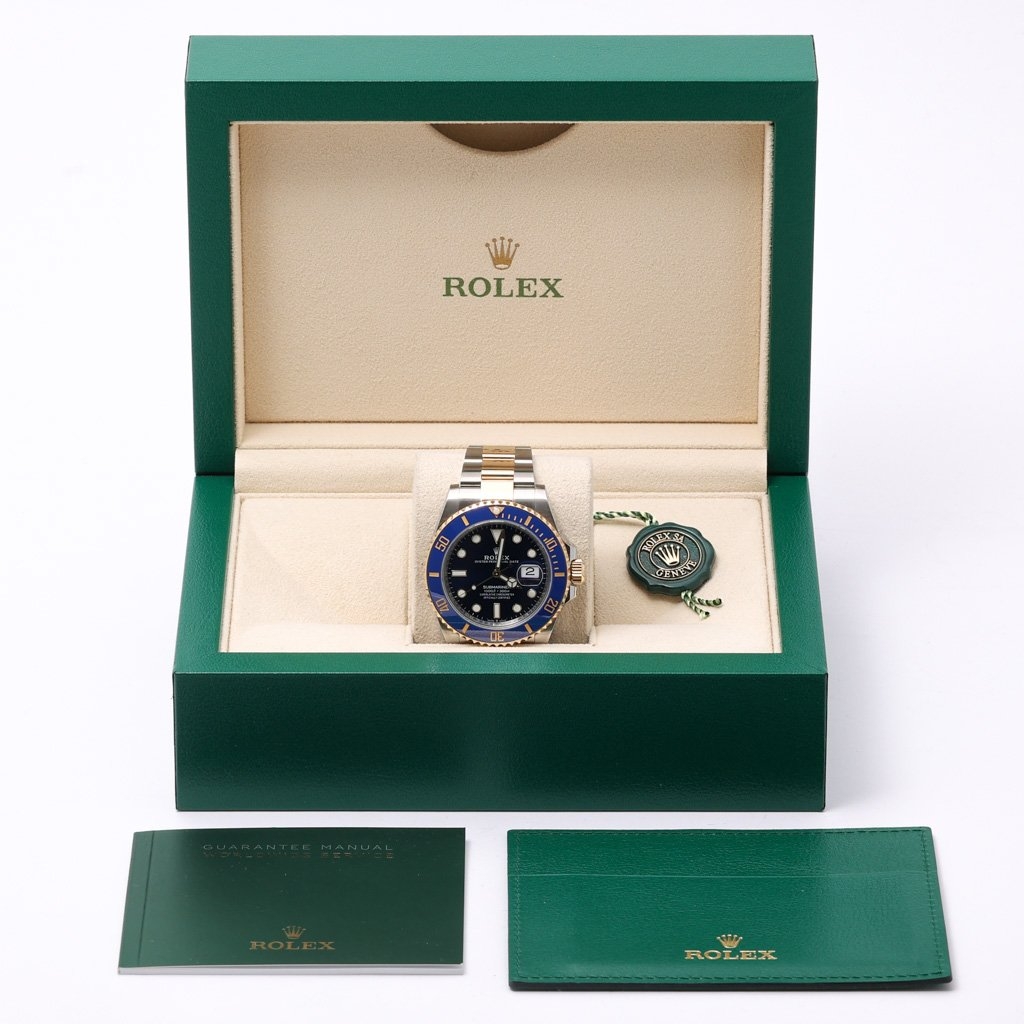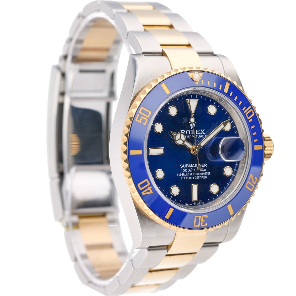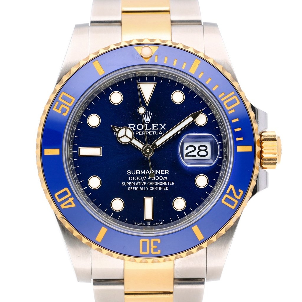 A Bi-Metal Rolex Submariner, model 126613LB, is an exceptional blend of professional dive capability and timeless luxury. Crafted from stainless steel and 18ct yellow gold, this 41mm model embodies Rolex’s mastery of design and engineering. The vibrant royal blue Cerachrom bezel and matching sunburst blue dial create a captivating visual harmony, enhanced by luminous hour markers and hands for superior readability in all lighting conditions. The iconic Oyster case and bracelet seamlessly combine durability with elegance, making this one of the most recognisable Submariners ever produced.
