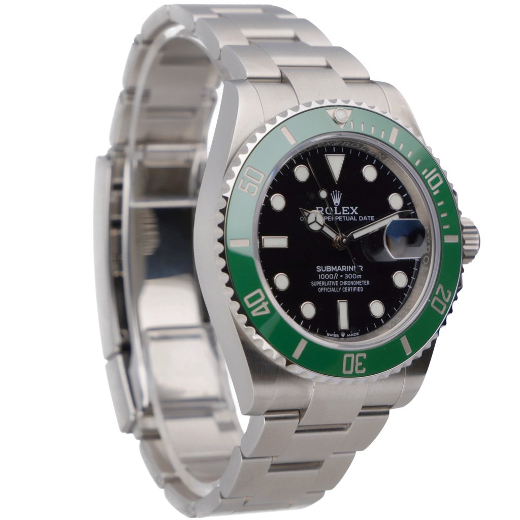 A Rolex Submariner "Starbucks", model 126610LV, crafted in stainless steel and featuring the striking green Cerachrom bezel paired with a crisp black dial — a bold modern update that nods to the legacy of the famed "Kermit." With its larger 41mm Oyster case and robust proportions, this reference delivers a strong wrist presence while retaining the classic design language of the Submariner line.