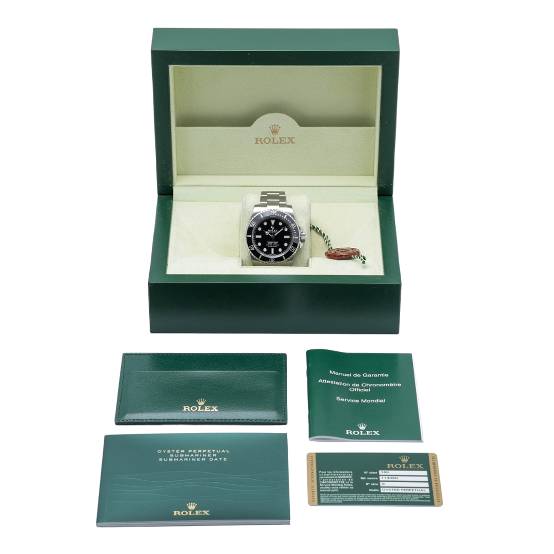A Rolex Submariner, model 114060, is a true icon of luxury and performance, epitomising the enduring legacy of Rolex's precision craftsmanship. Crafted in stainless steel, this 2013 model boasts a 40mm case with a sleek black bezel and matching black dial, delivering a classic, understated elegance synonymous with the Submariner name.