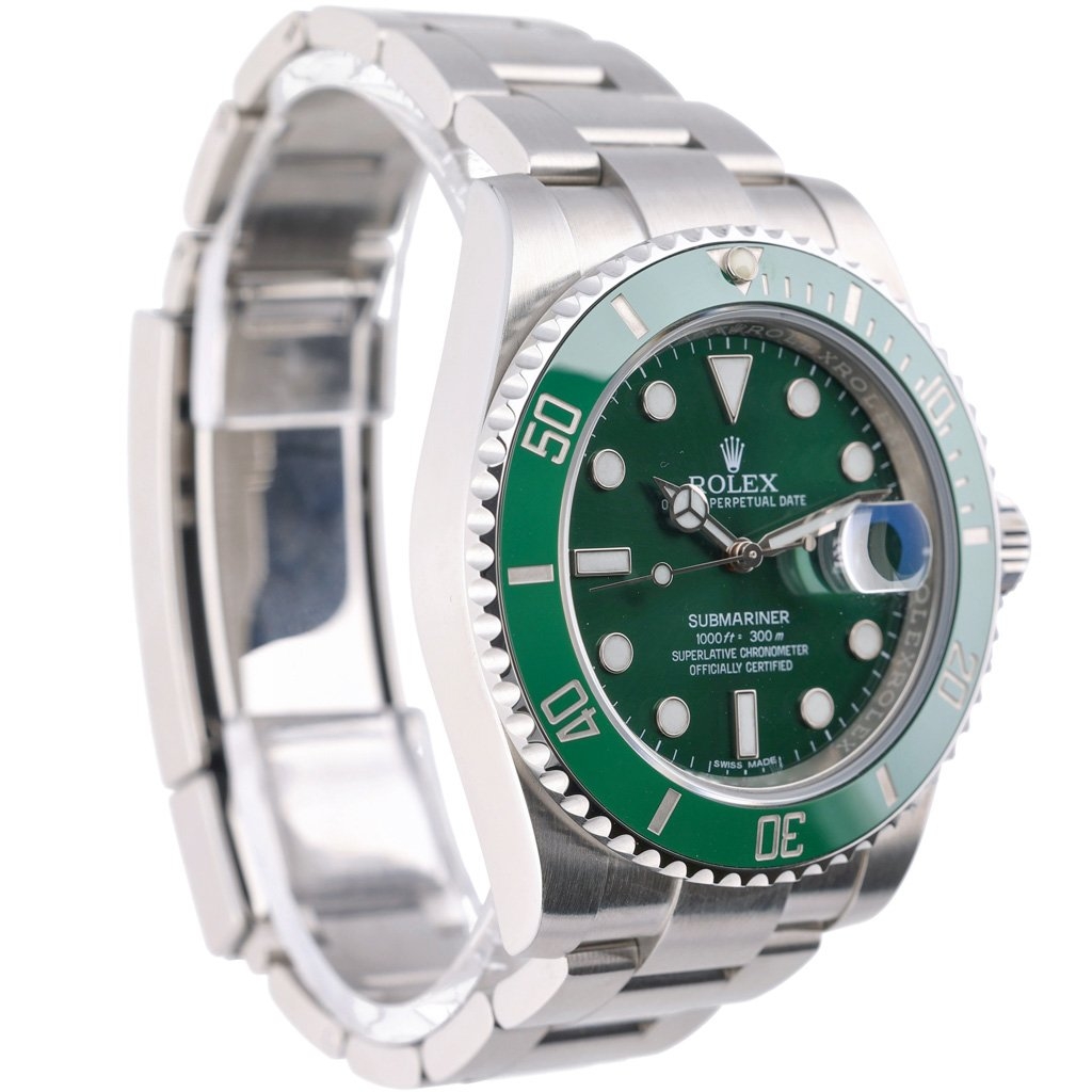 A Rolex Submariner 116610LV, affectionately known as the "Hulk," is a rare and highly coveted timepiece prized by collectors for its bold design and exclusivity. Discontinued by Rolex, this stainless steel model with its vibrant green ceramic bezel and matching sunburst green dial has become a modern classic. The distinctive colourway and timeless 40mm case design set it apart, making it an unmistakable icon in the world of luxury watches.