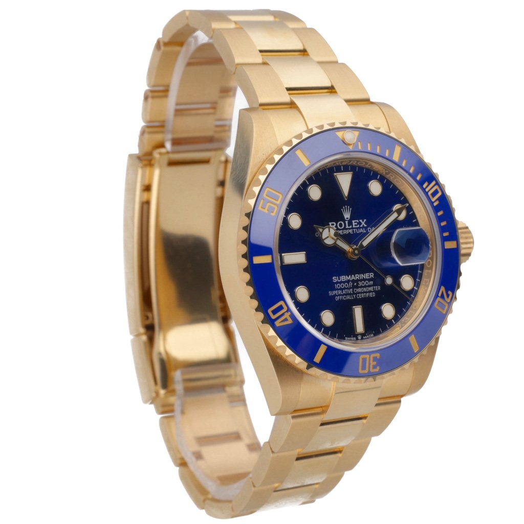 A Rolex Submariner Watch, model 126618LB, presented in immaculate condition. This 2025 reference is crafted entirely from 18ct yellow gold. It features the striking blue Cerachrom bezel paired with a deep blue dial, capturing one of the most recognisable precious-metal configurations in the Submariner line. Powered by the Rolex Calibre 3235 automatic movement, it is supplied with its original complete set of paperwork, presentation box, and manufacturer's warranty valid until 2030.