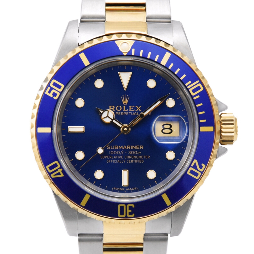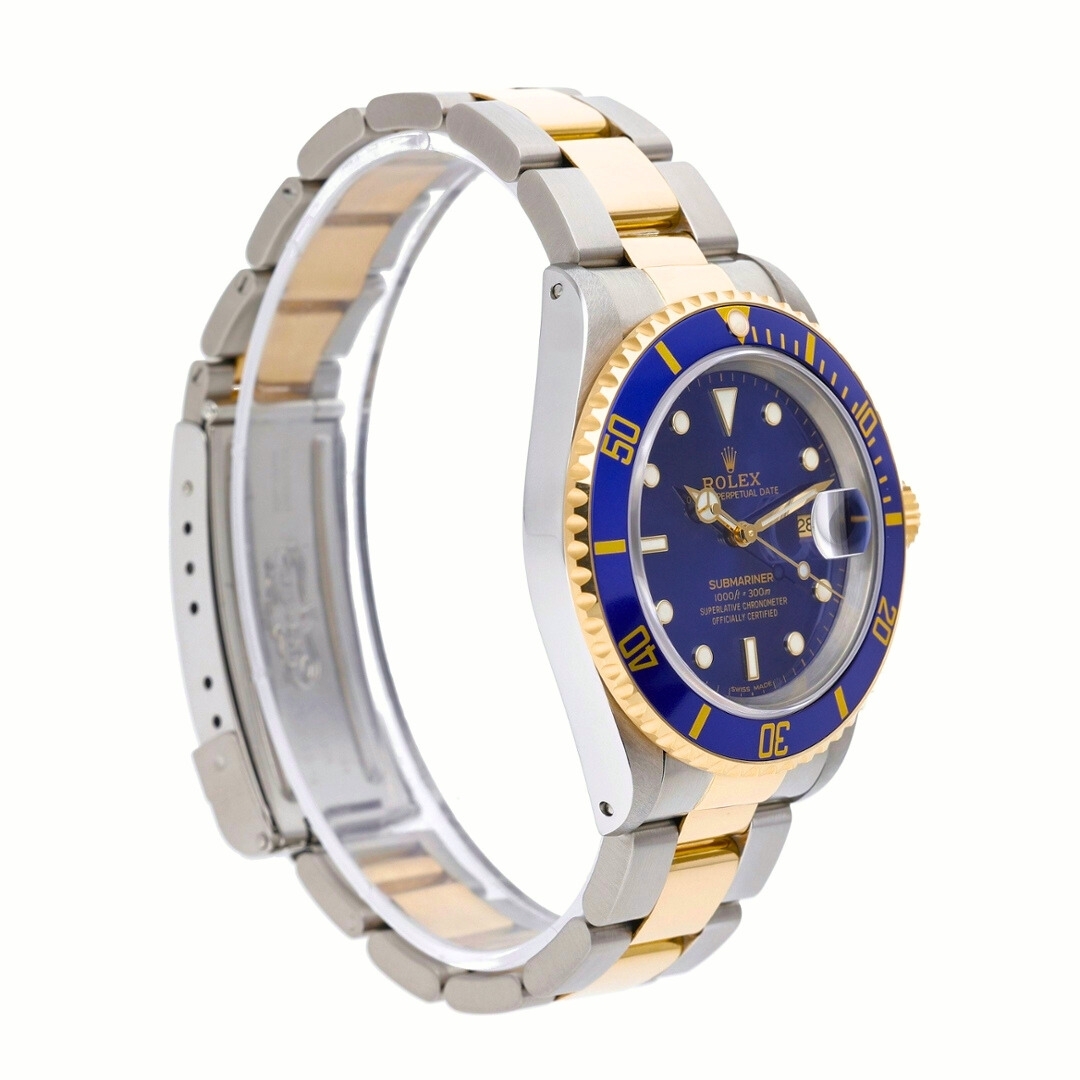 A Bi-Metal Rolex Submariner Watch, combining stainless steel and 18ct yellow gold, featuring the iconic blue dial and bezel combination. This 1996 reference 16613LB includes a 40mm Oyster case with a unidirectional rotating bezel and scratch-resistant sapphire crystal. The blue dial features luminous Mercedes hands, applied hour markers, and a date window at 3 o’clock, all beneath a Cyclops lens for easy legibility.