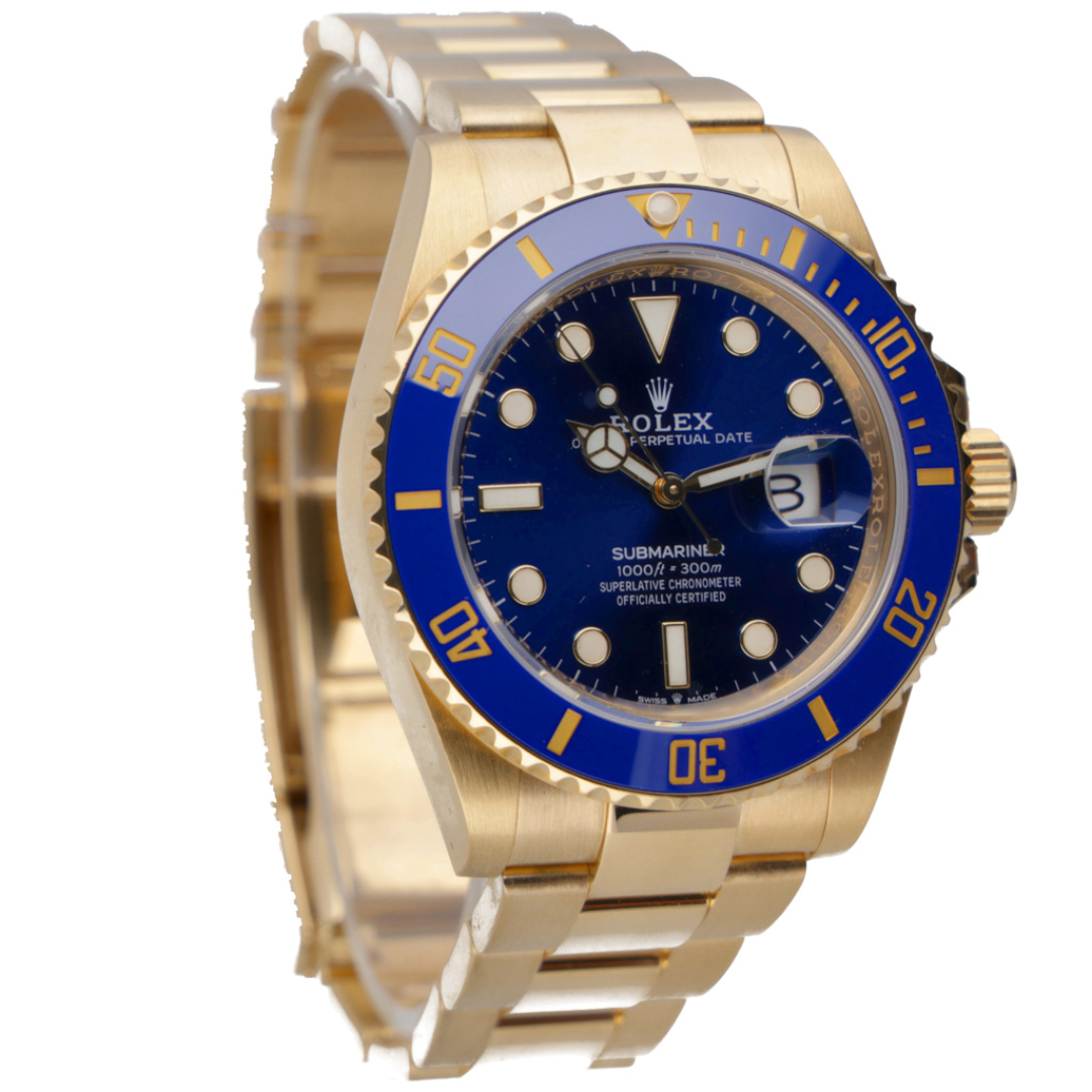 A Rolex Submariner watch in full 18ct yellow gold, featuring the unmistakable blue Cerachrom bezel and matching blue dial. This reference 126618LB represents the modern evolution of the classic gold Submariner, combining increased presence with refined proportions in the updated 41mm Oyster case. The luminous hour markers, Mercedes hands, and Cyclops date display deliver instant legibility while preserving the Submariner’s iconic tool-watch DNA.