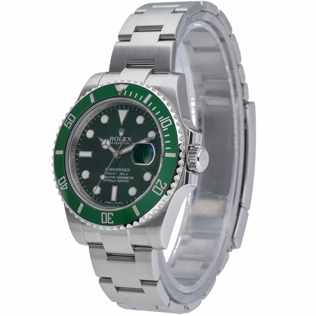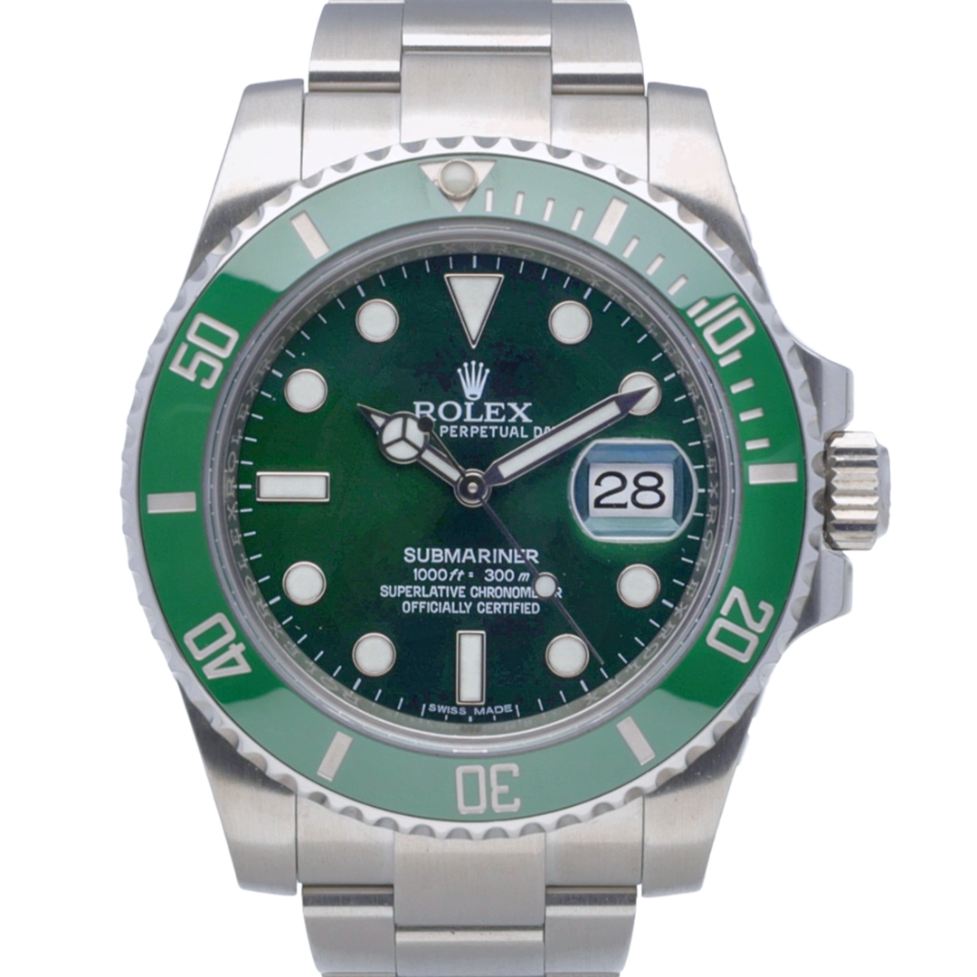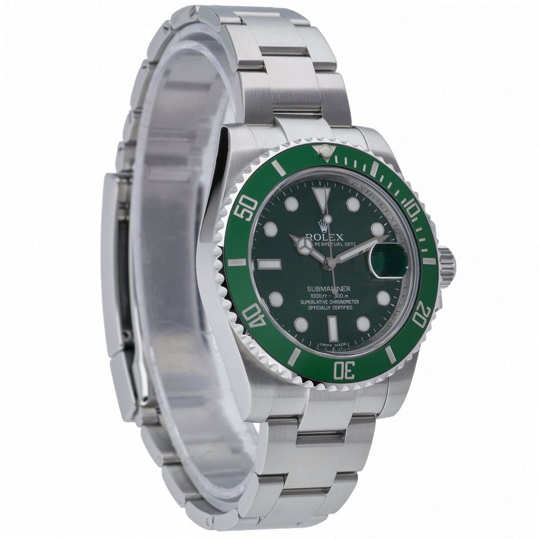 A Rolex Submariner reference 116610LV, often nicknamed the “Hulk,” is one of the most recognisable and collectable modern Submariner models ever produced. Crafted entirely from stainless steel, the 40mm case is paired with the instantly identifiable green Cerachrom bezel and matching green dial.