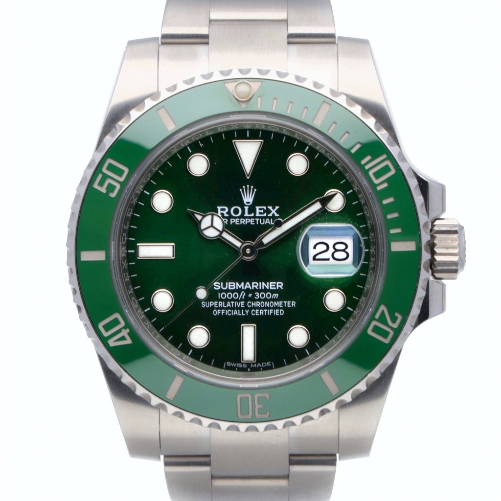 A Rolex Submariner reference 116610LV, commonly known as the “Hulk,” is one of the most iconic and collectible modern Submariner models ever produced. Crafted in stainless steel, the 40mm Oyster case is paired with a green Cerachrom bezel and matching green dial, a bold combination that set this reference apart from its introduction. Produced in 2017 and now discontinued, this example is presented in immaculate condition.