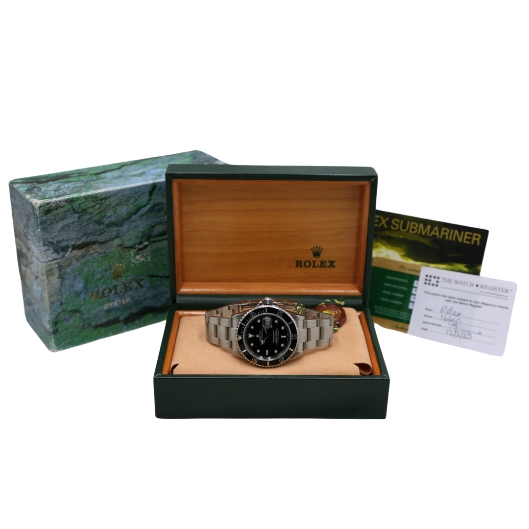 A Rolex Submariner watch, reference 16610, presented in immaculate condition. This 1993 example features a 40mm stainless steel Oyster case paired with a black aluminium bezel and ma atching black dial with luminous hour markers. Fitted to the classic Oyster bracelet, it is powered by the highly regarded Rolex Calibre 3135 automatic movement, renowned for its reliability and ease of service. The watch is supplied with original Rolex paperwork, boxed and certified, and covered by a 12-month WLC warranty.