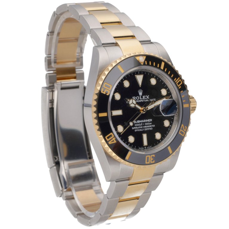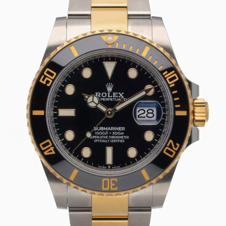A Bi-Metal Rolex Submariner Watch is a highly sought-after Rolex Submariner, reference 126613LN, presented in a striking combination of stainless steel and 18ct yellow gold. The 41mm case is paired with a black ceramic bezel featuring gold numerals, delivering both durability and bold visual contrast. The black dial, complete with luminous hour markers and Mercedes hands, ensures exceptional legibility, while the date display at 3 o’clock is enhanced by the signature Cyclops lens.